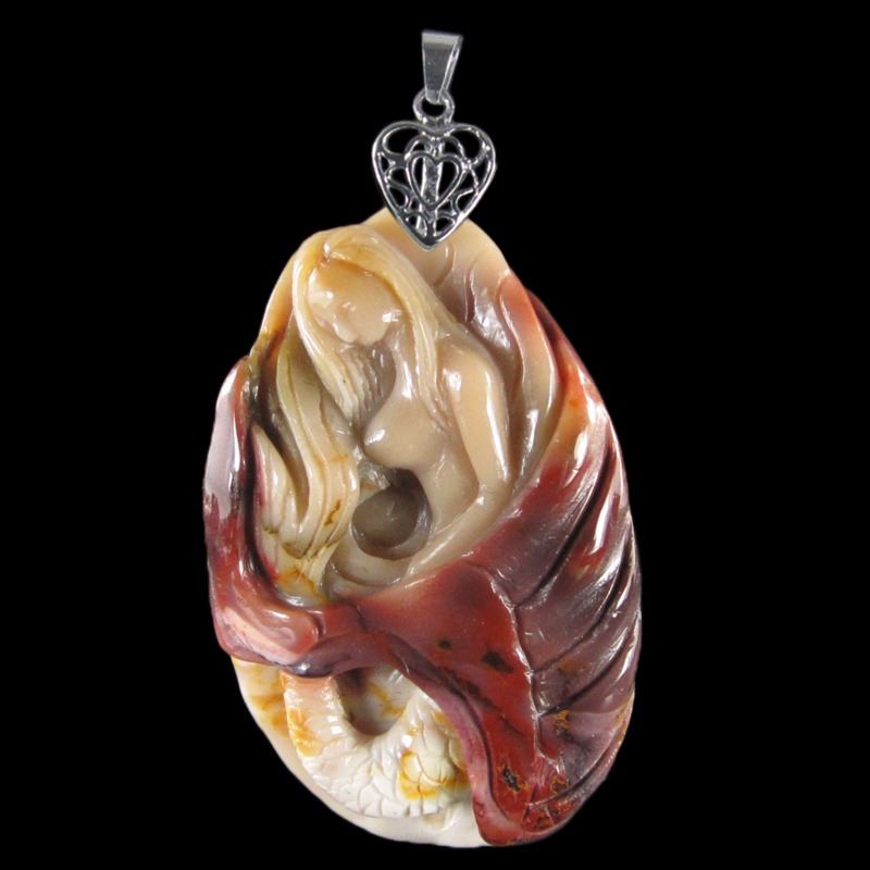 This is hand carved Mermaid Pendant bead *Stone Name Mookaite *Overall Dimension 75x39x12 mm (2.953x1.535x0.472 inch )mm *Weight 185 ct/ 37 g/ 1.305138 oz*Locality Australia *Appearance opaque *Color Red Yellow Pink White *Mohs Hardness 6-7 *Source Natural *Treatments None *Drilled YES diameter 2.5/36-3/36 inch **This Mermaid bead is handcarved out of one piece of gemstone Mookaite .The creative design of each item is based on the stone's natural color and pattern and it demands great craftmenship and patience to complete . This beauty is absolutely a unique center piece for your jewelry design. .