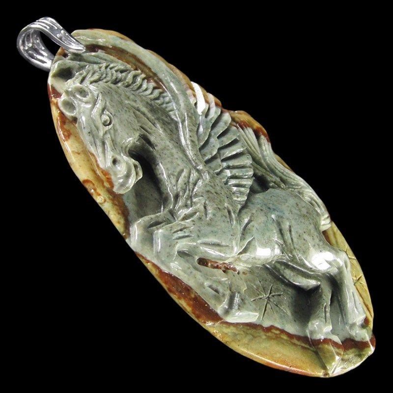 This is a hand carved Pegasus Pendant *Stone Name Succor Creek Jasper *Overall Dimension 89x49x11 mm (3.504x1.929x0.433 inch )mm *Weight 250 ct/ 50 g/ 1.7637 oz *Mohs Hardness 7 *Source Natural *Treatments None *Drilled YES diameter 2.5/36-3/36 inch *Other Names Unknown*This Pegasus bead is handcarved out of one piece of gemstone Succor Creek Jasper .The creative design of each item is based on the stone's natural color and pattern and it demands great craftmenship and patience to complete . This beauty is absolutely a unique center piece for your jewelry design. .~~~~~~~~~