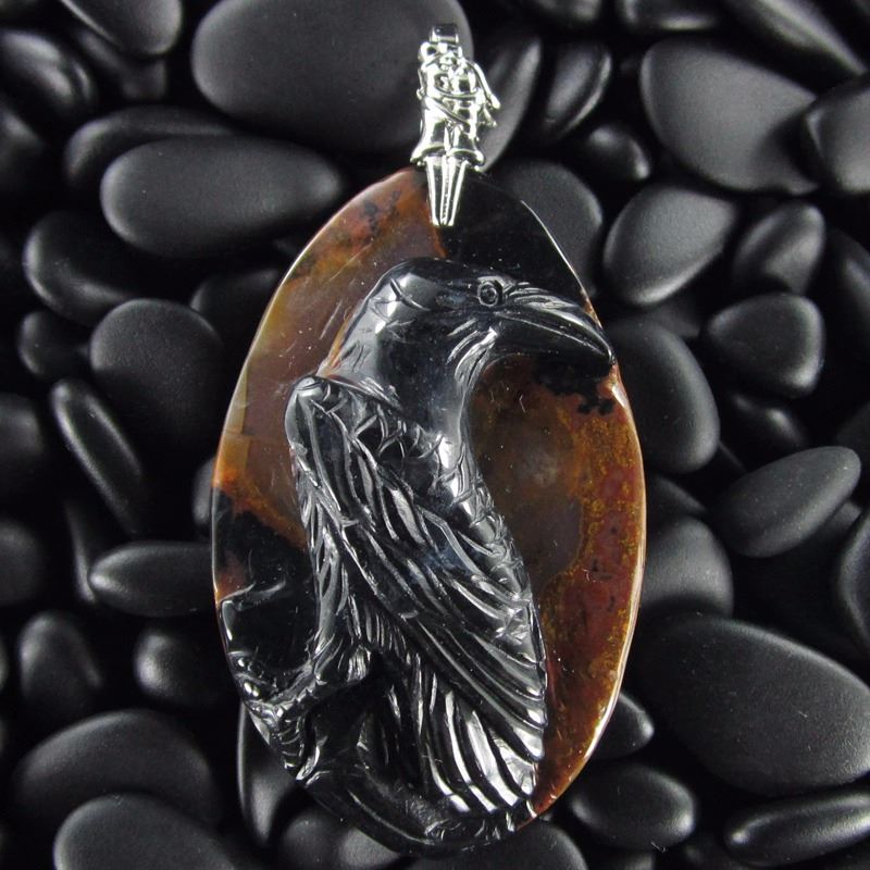 This is a hand carved Zebra Agate Raven pendant . A silver plated bail is installed . It can be easily removed if you have other design in mind *Pendant Properties *Stone Name Zebra Agate *Overall Dimension 78x40x14 mm (3.071x1.575x0.551 inch )mm *Weight 185 ct/ 37 g/ 1.305138 oz*Stone Properties *Locality South Africa *Appearance opaque to semi-transparent *Color white and black *Mohs Hardness 7 *Source Natural *Treatments None *Drilled YES diameter 2.5/36-3/36 inch *Other Names*This Raven bead is handcrafted out of one piece of gemstone Zebra Agate .The creative design of each item is based on the stone's natural color and pattern and it demands great craftmenship and patience to complete . This beauty is absolutely a unique center piece for your jewelry design. .