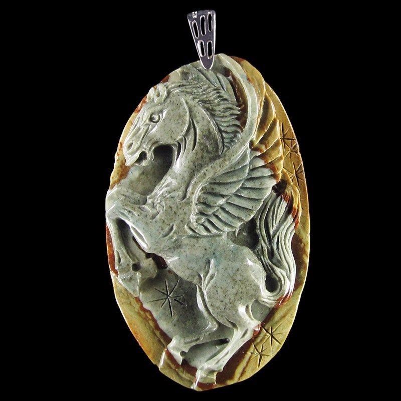 This is a hand carved Pegasus Pendant *Stone Name Succor Creek Jasper *Overall Dimension 89x49x11 mm (3.504x1.929x0.433 inch )mm *Weight 250 ct/ 50 g/ 1.7637 oz *Mohs Hardness 7 *Source Natural *Treatments None *Drilled YES diameter 2.5/36-3/36 inch *Other Names Unknown*This Pegasus bead is handcarved out of one piece of gemstone Succor Creek Jasper .The creative design of each item is based on the stone's natural color and pattern and it demands great craftmenship and patience to complete . This beauty is absolutely a unique center piece for your jewelry design. .~~~~~~~~~