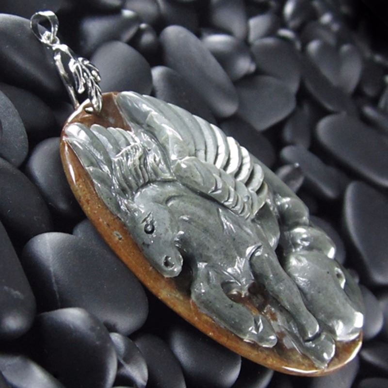 This is a hand carved Succor Creek Jasper Pegasus pendant . A silver plated bail is installed . It can be easily removed if you have other design in mind *Pendant Properties *Stone Name Succor Creek Jasper *Overall Dimension 81x43x13 mm (3.189x1.693x0.512 inch )mm *Weight 200 ct/ 40 g/ 1.41096 oz; *Color Brown Gray yellowish bluish *Mohs Hardness 7 *Source Natural *Treatments None *Drilled YES diameter 2.5/36-3/36 inch *Other Names Unknown*This Pegasus bead is handcrafted out of one piece of gemstone Succor Creek Jasper .The creative design of each item is based on the stone's natural color and pattern and it demands great craftmenship and patience to complete . This beauty is absolutely a unique center piece for your jewelry design. .