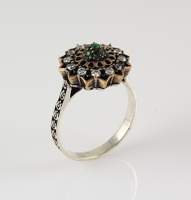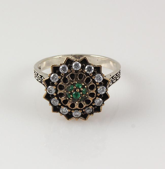 Natural Stone Statement Victorian Design Ring **|**|** 6.14g Natural Stone Emerald Beryl Victorian Flower Design Ring w/ cz diamonds; stamp 925 ; MSRP: $0