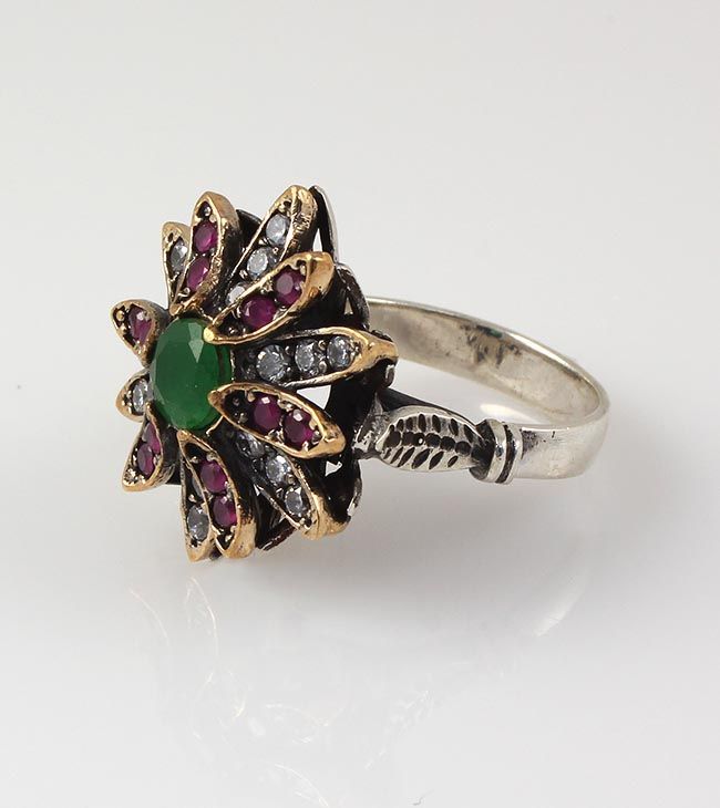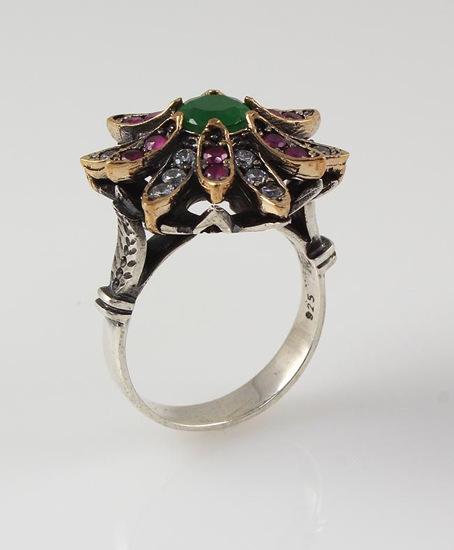 Natural Stone Statement Victorian Design Ring **|**|** 7.76g Natural Stone Emerald Beryl (6MM) & Ruby Victorian Design Ring w/ cz dia; stamp 925 ; MSRP: $100