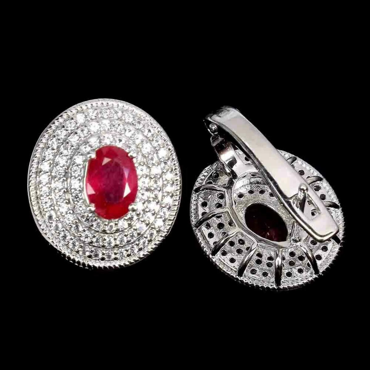 925 STERLING SILVER;PLATE-14K WHITE GOLD;MAIN STONE-RUBY;OTHER GEMS-WHITE TOPAZ;TOTAL WEIGHT-7.39 GRAM (TOTAL WEIGHT OF SILVER + STONE)DIMENSION-* STONE 1.0 TO 7.0 X 5.0 MM.;* FACE EARRINGS- 16.0 X 14.0 MM.;MAIN STONE SHAPE-OVAL CUT;MAIN STONE COLOR- BLOOD RED;TREATMENT-Yes;ORIGIN-MADAGASCAR;HARDNESS-9.0;