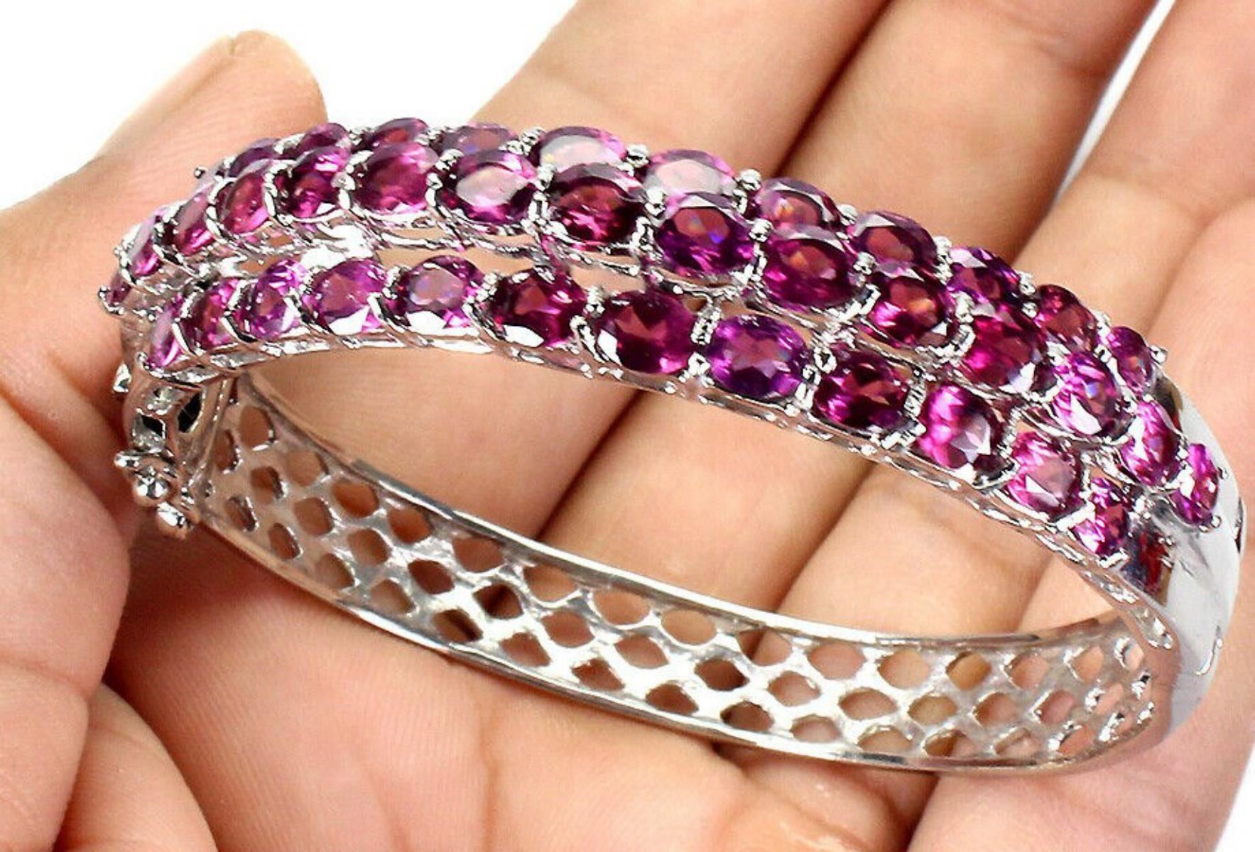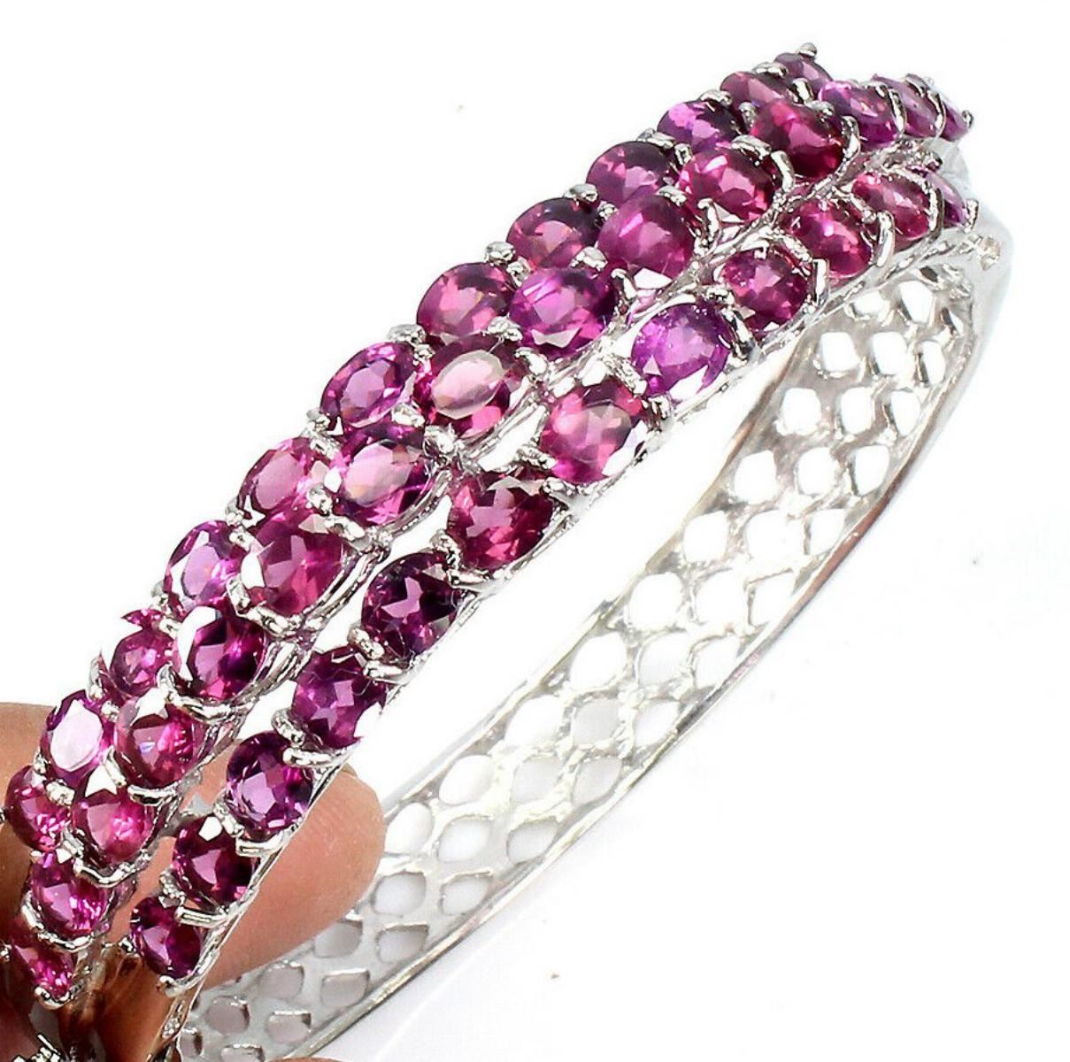 925 STERLING SILVER;PLATE-14K WHITE GOLD;MAIN STONE-RHODOLITE GARNET;TOTAL WEIGHT-28.24 GRAM (TOTAL WEIGHT OF SILVER + STONE)DIMENSION-* STONE 5.0 X 4.0 MM. * DIAMETER 24.0 X 2.3 INCHES. * FACE BANGLE 62.0 X 12.0 MM.;MAIN STONE SHAPE-OVAL CUT;MAIN STONE COLOR- RICH PINK RASPBERRY;CLARITY/GRADE-IF TO VVS;TREATMENT-UNHEATED;ORIGIN-AFRICA;HARDNESS-7.0 - 7.5;