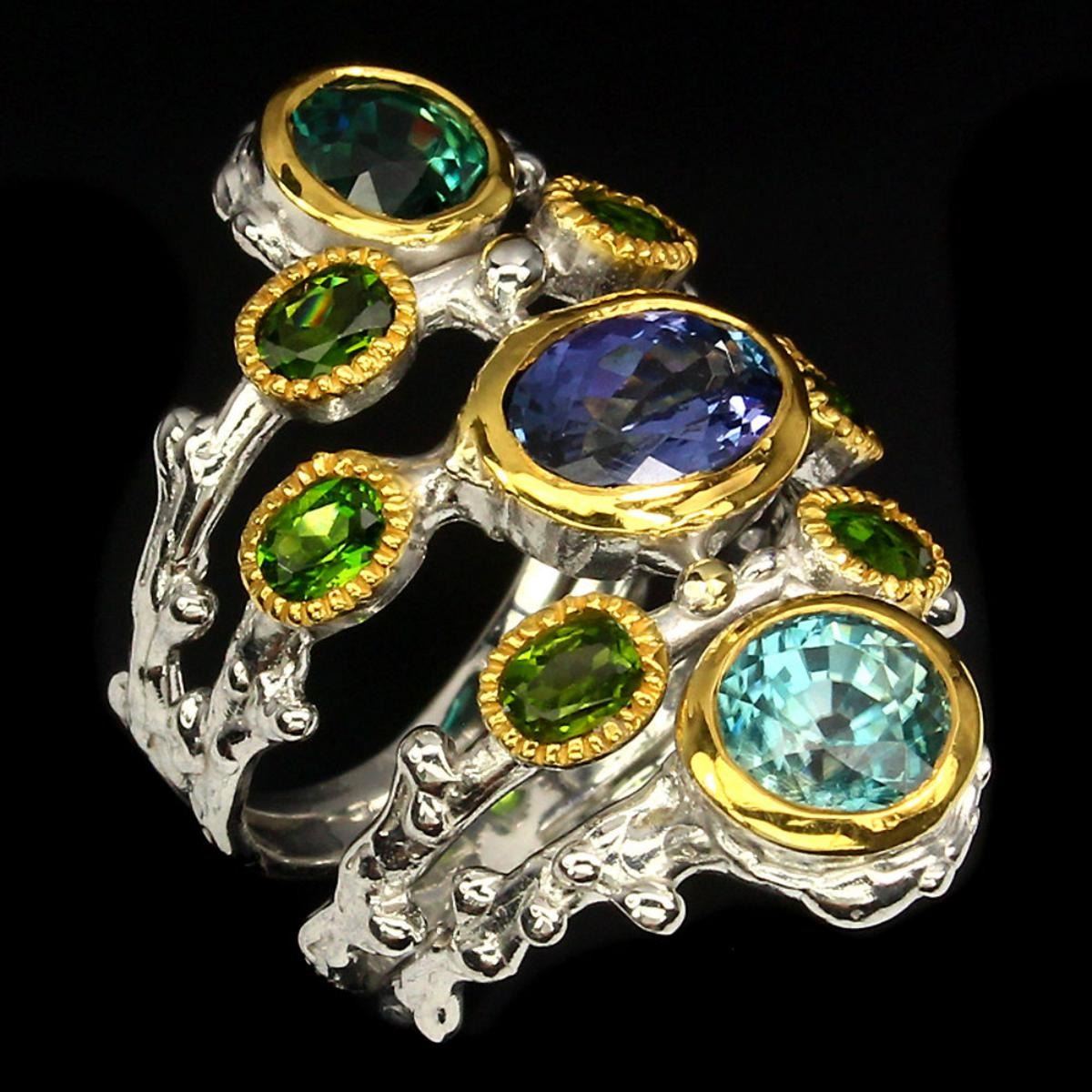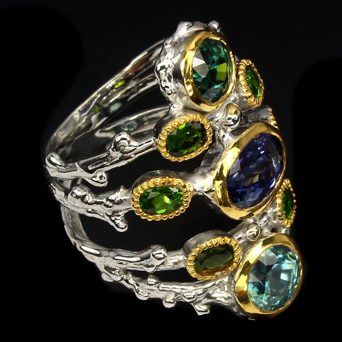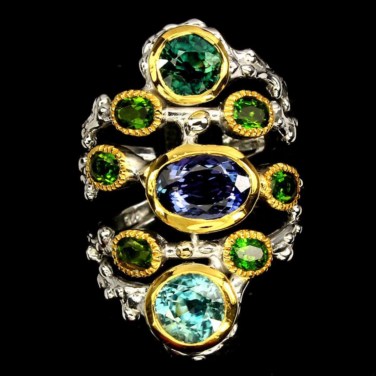 925 STERLING SILVER PLATE 2-TONE WHITE YELLOW 14K GOLD RING SIZE - 6.5 OTHER GEMS -CHROME DIOPSIDE,TANZANITE; TOTAL WEIGHT -46.59 CT (TOTAL WEIGHT OF SILVER + STONE) DIMENSION * STONE 4.0 X 3.0 TO 8.0 X 6.0 MM. * FACE RING -31.0 X 20.0 MM.; CLARITY/GRADE -IF TO VVS; LUSTER -GRACIOUS; ORIGIN - Tanzania CAMBODIA; HARDNESS -5.0 - 7.5