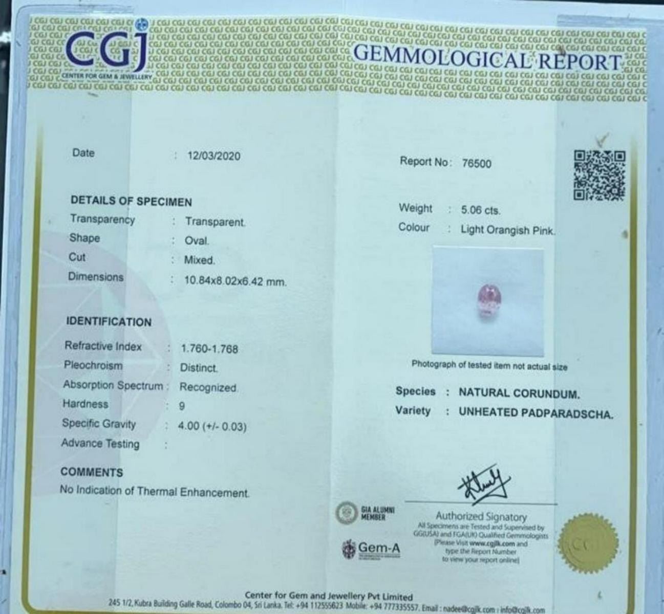 Natural SunSet Padparadscha 5.06 Carats - GRS Certified.....This sapphire was recut from its original weight which was 5.19 to 5.06 Carats to get better clarity.....both certificates are attached. Completely eye clean...completely untreated, Origin - Sri Lanka.