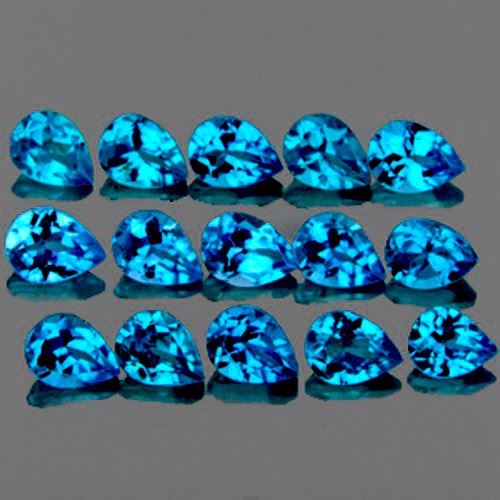 Natural Blue Topaz WEIGHT : 5.22 cts SHAPE : Pear SIZE ( L x W x D ) : 5.00 x 4.00 mm QUANTITY : 15 pieces ( Perfectly Matched Set ) COLOR : Top Swiss Blue CLARITY : IF-VVS1 ORIGIN : Brazil HARDNESS : 8 LUSTER : Excellent!!! TREATMENT : Heated