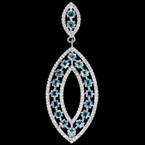 GENUINE SWISS BLUE TOPAZ & WHITE CZ 925 SILVER PENDANT 14K WHITE GOLD COATING;STONE SHAPESQUARE FACET CUTSTONE DIMENSION4 X 4 MM.MAIN STONE WEIGHT5.4 CARATCOLORSWISS BLUECLARITYIF TO VVSLUSTERDAZZLINGTREATMENTIRRADIATIONORIGIN OF STONEAFRICAHARDNESS8OTHERFACE OF PENDANT 65 X 23 MM. WHITE CUBIC ZIRCONIA 1.2 MM. TOTAL 5.76 G.