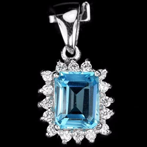 GENUINE AAA SWISS BLUE TOPAZ & WHITE CZ 925 SILVER PENDANT14K WHITE GOLD COATING; STONE SHAPEEMERALD FACET CUTSTONE DIMENSION9 X 7 X 4.9 MM.MAIN STONE WEIGHT3.2 CARATCOLORSWISS BLUECLARITYIFLUSTERENCHANTINGTREATMENTIRRADIATIONORIGIN OF STONEAFRICAHARDNESS8OTHERFACE OF PENDANT 23 X 12 MM. WHITE CUBIC ZIRCONIA 1.7 MM. TOTAL 3.2 G.