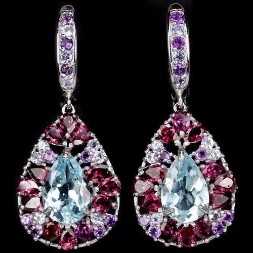 REAL TOPAZ AMETHYST RHODOLITE TANZANITE 925 SILVER EARRING14K WHITE GOLD COATING; STONE SHAPE PEAR ROUND PORTUGUESE CUT STONE DIMENSION 12 X 8 MM. , 4 X 3 MM. , 2 MM. ITEM WEIGHT -9 GRAM; COLOR -MULTI COLOR; CLARITY -IF, VVS, VS SI; TREATMENT -IRRADIATION NATURAL UNHEATED; ORIGIN OF STONE -AFRICA, BRAZIL TANZANIA; HARDNESS -7 - 8;