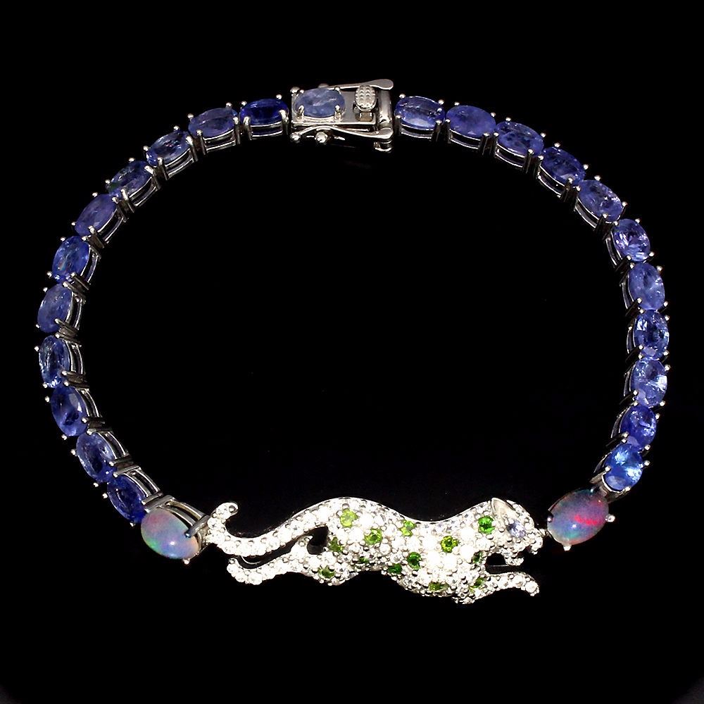 925 STERLING SILVER; PLATE -14K WHITE GOLD; LENGTH (INCHES) -7.5; MAIN STONE -TANZANITE; OTHER GEMS -CHROME DIOPSIDE,CUBIC ZIRCONIA,FIRE OPAL; TOTAL WEIGHT -73.92 CT (TOTAL WEIGHT OF SILVER + STONE) DIMENSION * STONE 1.5 TO 7.0 X 5.0 MM. * CZ 1.0 MM. * FACE BRACELET 180.0 X 14.0 MM.; MAIN STONE SHAPE -OVAL CUT; MAIN STONE COLOR -TOP RICH BLUE VIOLET; ORIGIN TANZANIA - AFRICA; HARDNESS -7.0 - 7.5