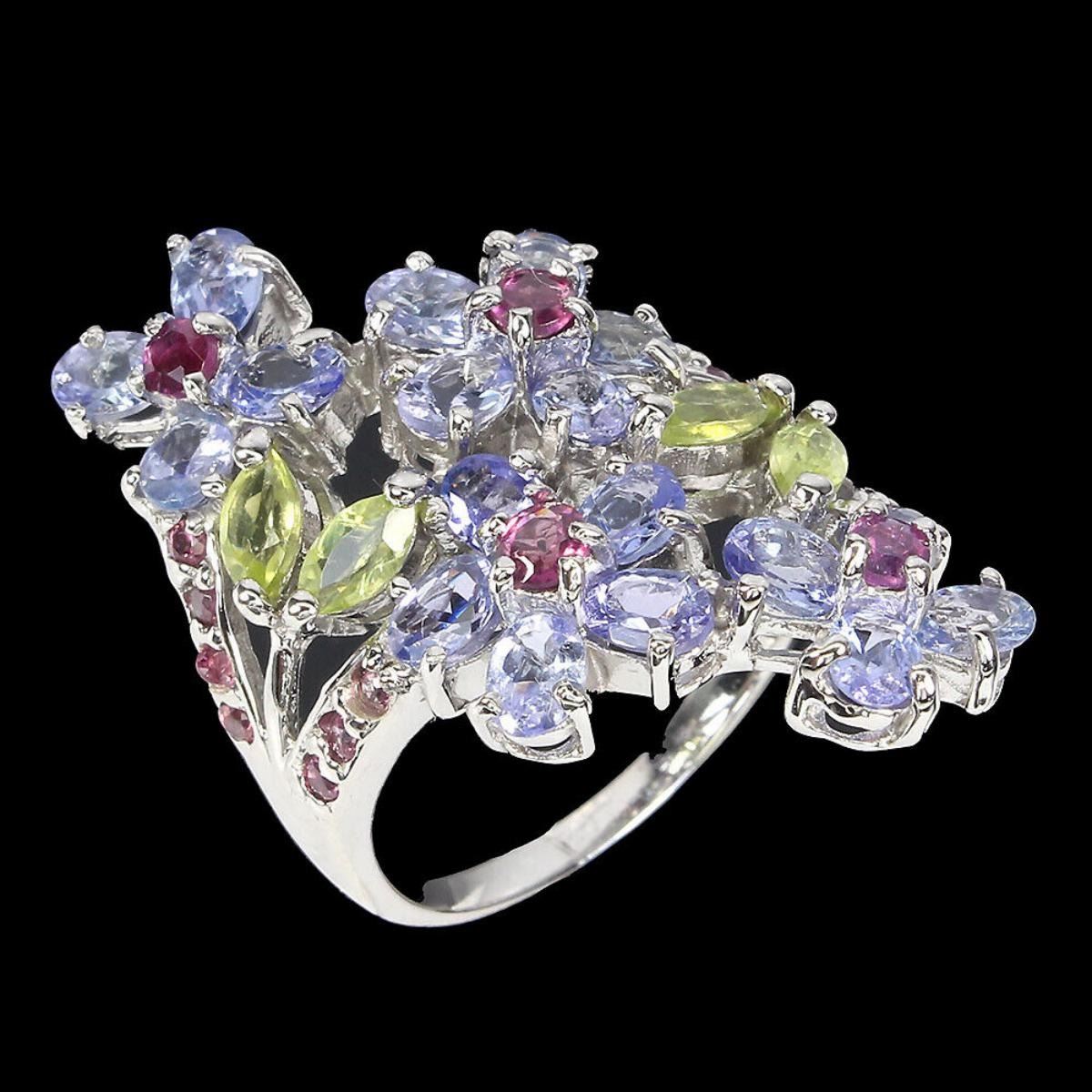 925 STERLING SILVER;PLATE-14K WHITE GOLD;RING SIZE/resizeable-7;MAIN STONE-TANZANITE;OTHER GEMS-PERIDOT, RHODOLITE GARNET;TOTAL WEIGHT-6.43 GRAM (TOTAL WEIGHT OF SILVER + STONE)DIMENSION-* STONE 1.5 TO 5.0 X 2.5 MM. * RING SIZE 7.0 * FACE RING- 32.0 X 21.0 MM.;MAIN STONE SHAPE-OVAL CUT;MAIN STONE COLOR-TOP NICE BLUE VIOLET;CLARITY/GRADE-IF TO VVS;;TREATMENT-UNHEATED;ORIGIN-TANZANIA - AFRICA;HARDNESS-7.0 - 7.5;