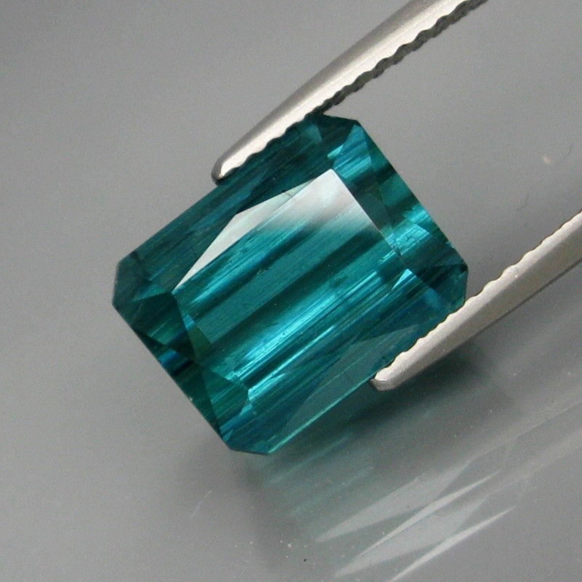 Tourmaline SHAPE Emerald Cut WEIGHT 5.78 Ct.SIZE 10.7 X 8.6 X 7.1 mm QUANTITY 1 Piece; COLOR Blue;CLARITY - As shows in Image;LUSTER Superior ORIGIN Mozambique TREATMENT None HARDNESS 7-7.5