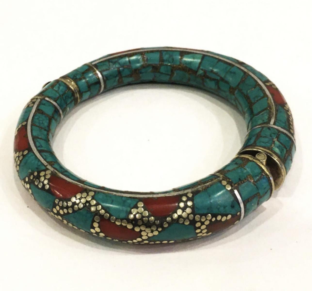 Natural Tibet Hand Made Tibet Coral & Turquoise free size Bangle.......This Bangle is made by Tibet Tribal ladies...completely natural stones....its free size as there is lock to open the bangle and fits all sizes.