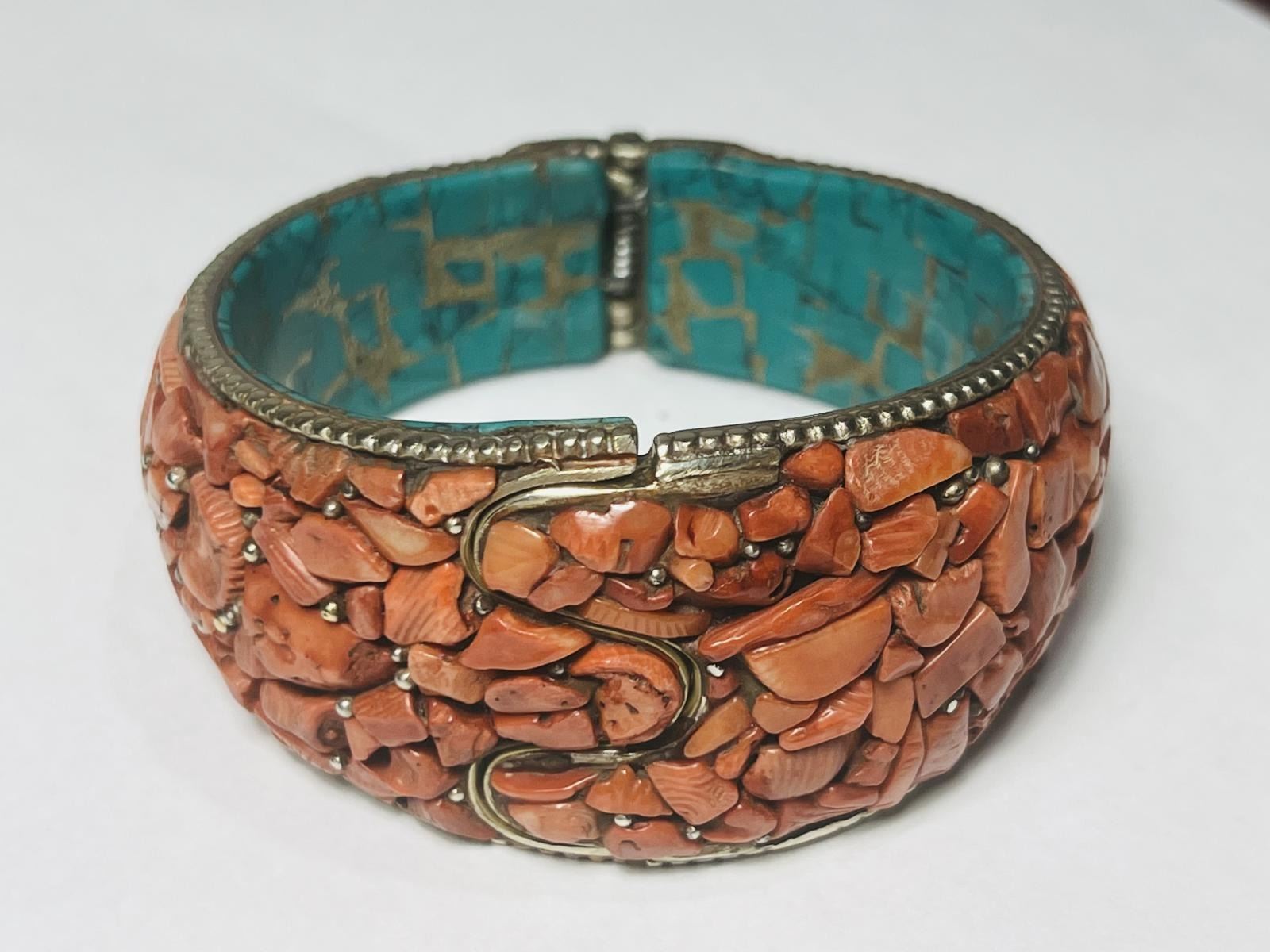 Natural Tibet Hand Made Coral & Turquoise free size wide Bangle......This Bangle is made by Tibet Tribal ladies...completely natural stones....its free size as there is lock to open the bangle and fits all sizes.