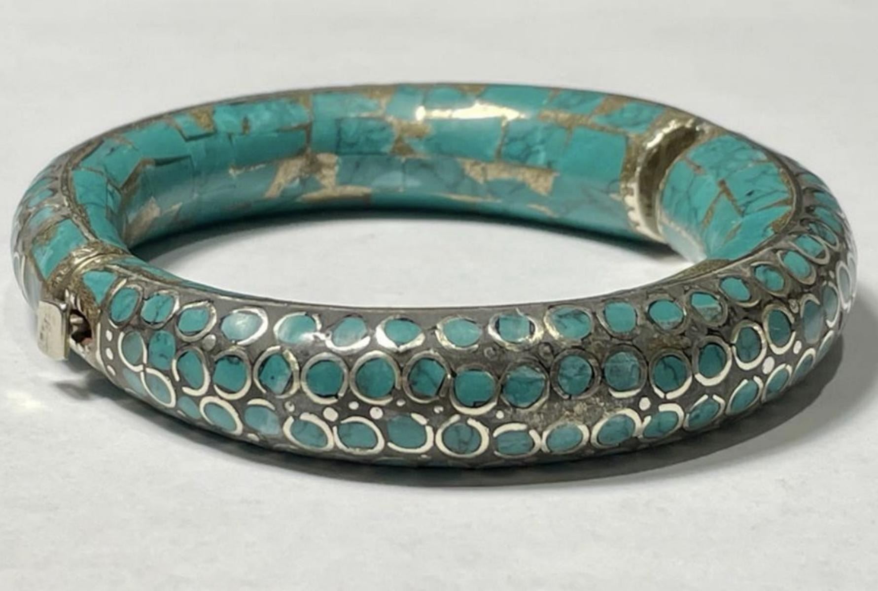 Natural Hand Made Tibet Turquoise free size Bangle.......This Bangle is made by Tibet Tribal women...completely natural stones....it is free size as there is a lock to open the bangle and fits all sizes.