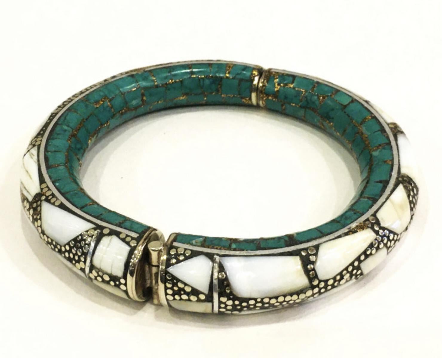 Natural Tibet Hand Made Turquoise & Sea Shell free size Bangle.......This Bangle is made by Tibet Tribal ladies...completely natural stones....its free size as there is lock to open the bangle and fits all sizes.