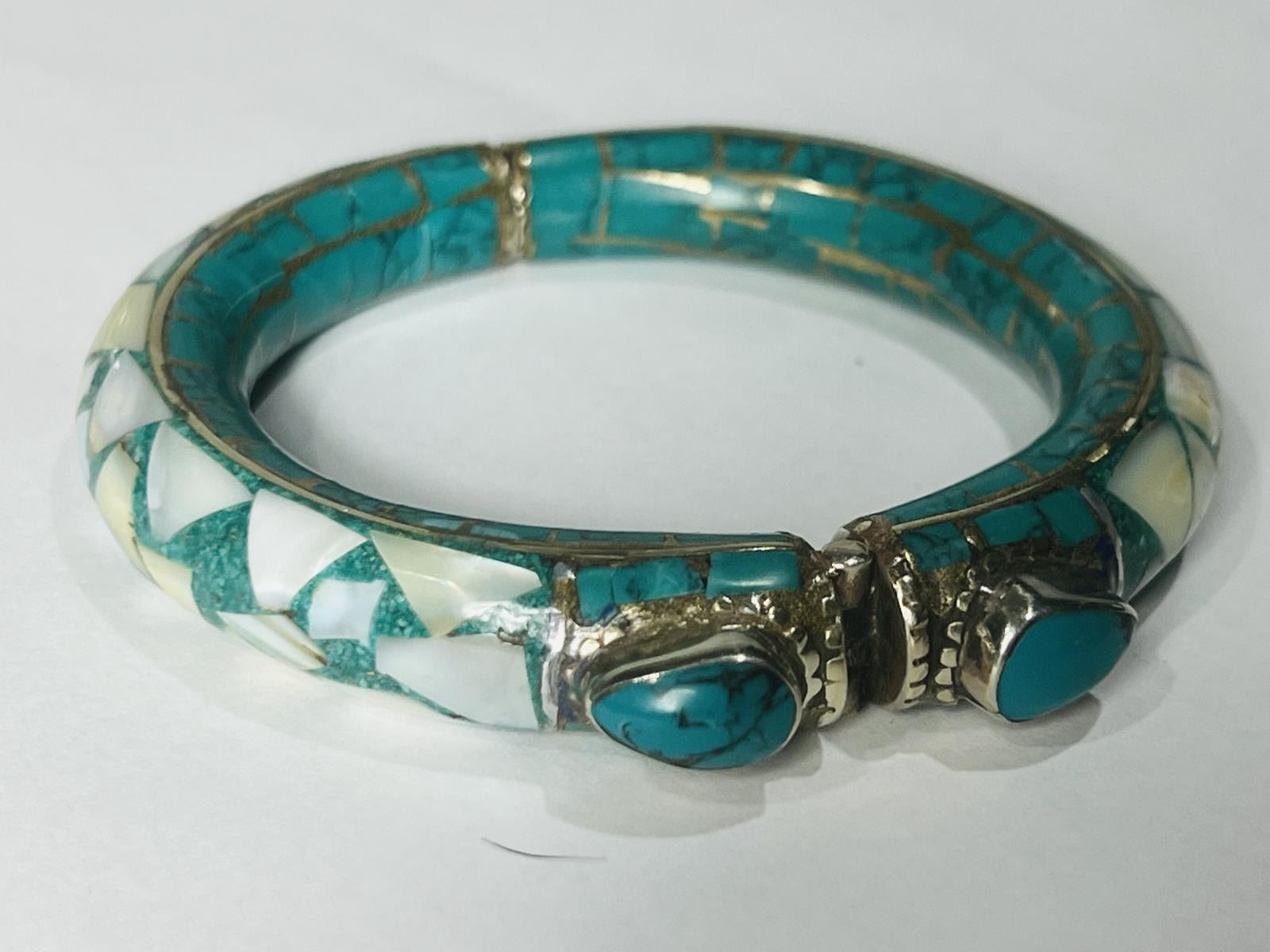 Natural Tibet Hand Made Turquoise & Sea Shell free size Bangle.......This Bangle is made by Tibet Tribal ladies...completely natural stones....its free size as there is lock to open the bangle and fits all sizes.