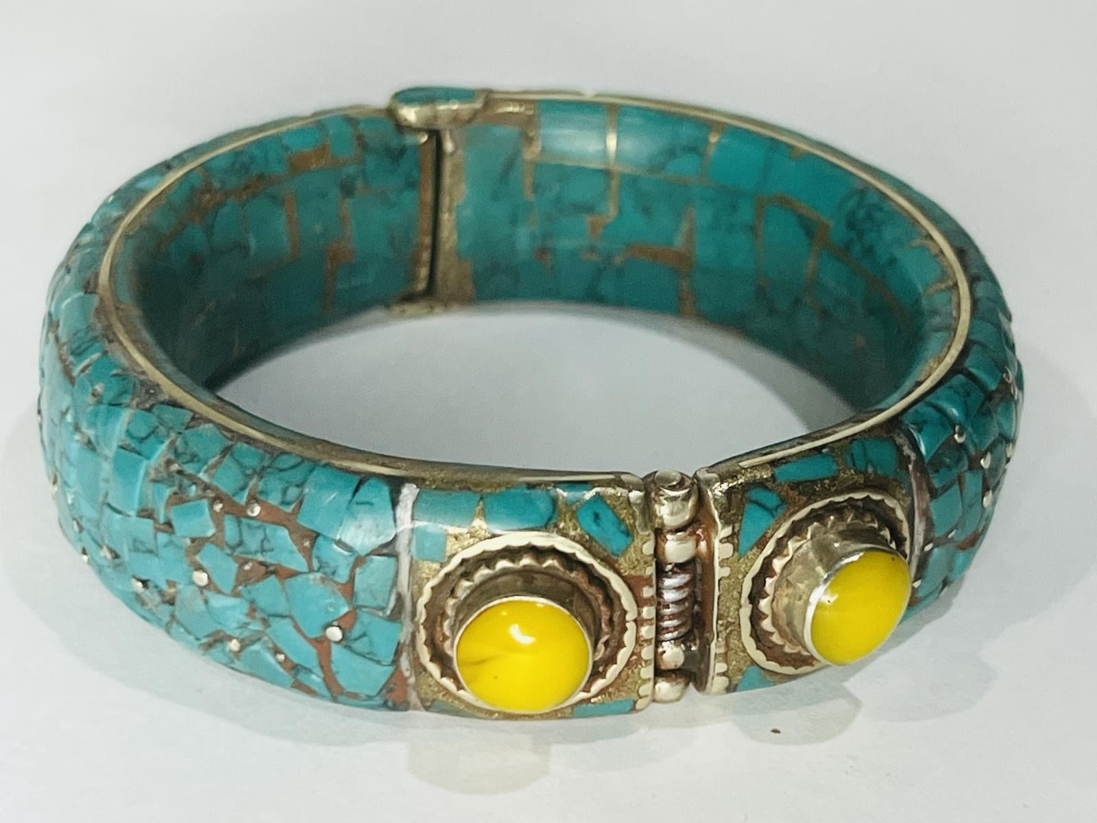 Natural Tibet Hand Made Turquoise free size wide Bangle.......This Bangle is made by Tibet Tribal ladies...completely natural stones....its free size as there is lock to open the bangle and fits all sizes.