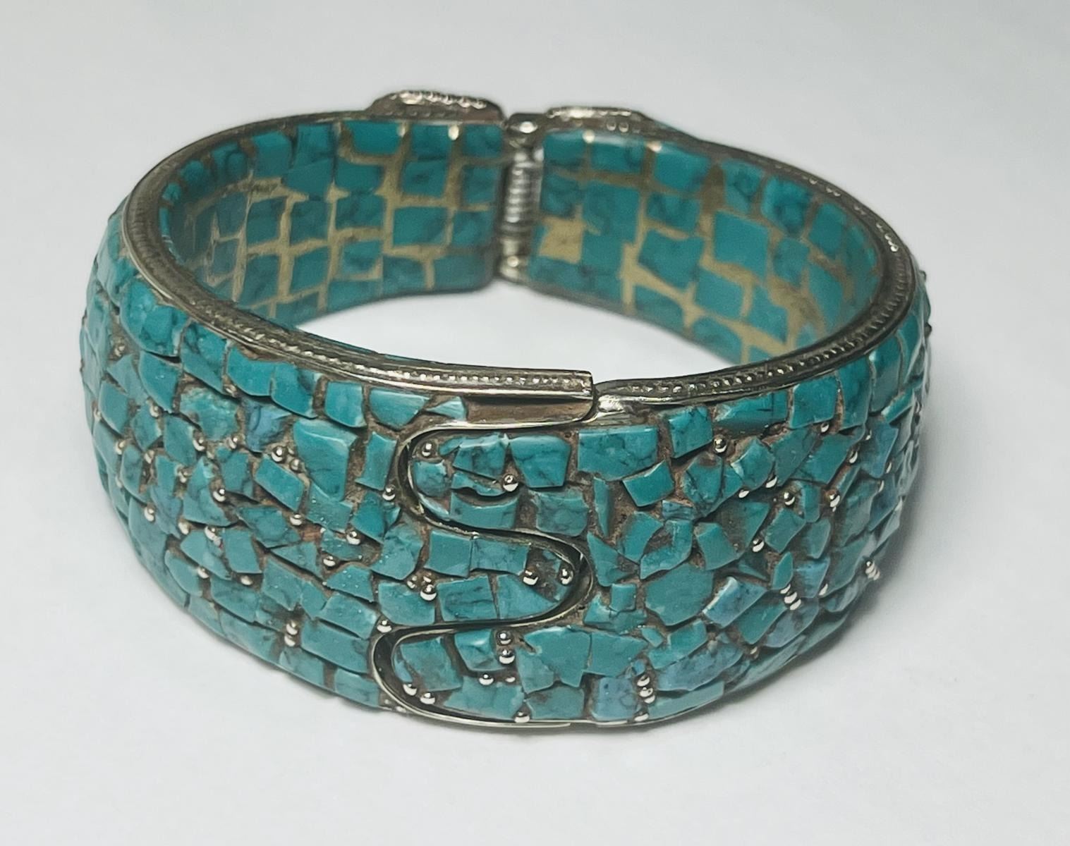 Natural Tibet Hand Made Wide Turquoise free size Bangle.......This Bangle is made by Tibet Tribal ladies...completely natural stones....its free size as there is lock to open the bangle and fits all sizes.The widest part is 32mm.