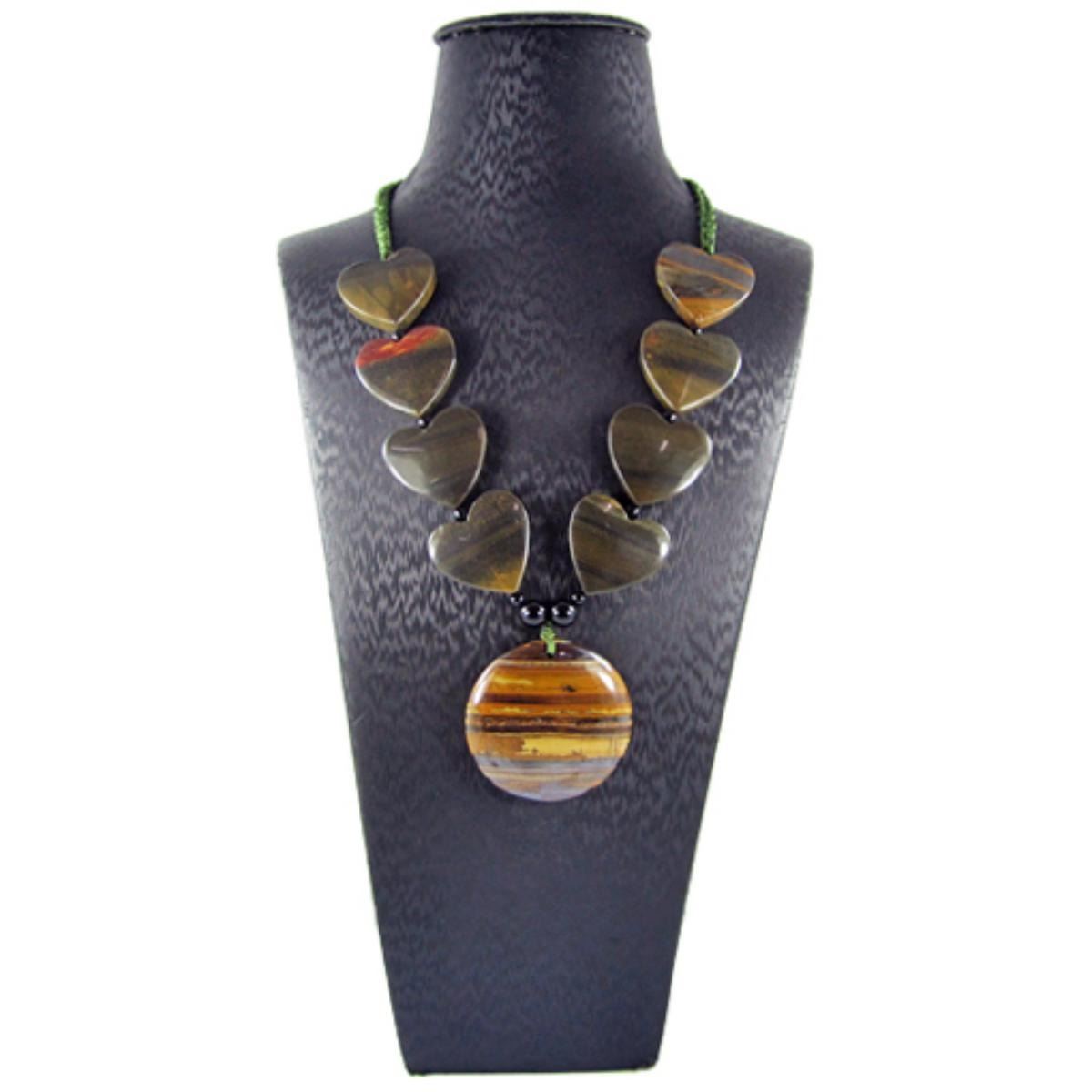 Stone Name Tiger's Eye *Stone Overall Dimension for each bead 48x48x6 mm (1.890x1.890x0.236 inch ) *Weight 645 ct/ 129 g/ 4.550346 oz*Handcrafted knot chainOther Stones used in this Necklace Tiger's Eye*Center Stone Properties *Locality Australia *Appearance opaque *Color yellow-to red-brown with a silky luster *Mohs Hardness 7 *Source Natural *Treatments None *Drilled YES diameter 2.5/36-3/36 inch *Other Names Heliotrope~~~~~~~~~(+) Each step of our Lapidary work is under tight quality control . With the best pattern-color combination possible in mind the initial cut was done by experienced lapidary ... The last-step diamond polishing makes the surface of each bead/cab mirror-like glossy that meet the highest standard possible. Finally only those met all quality requirements are selected.