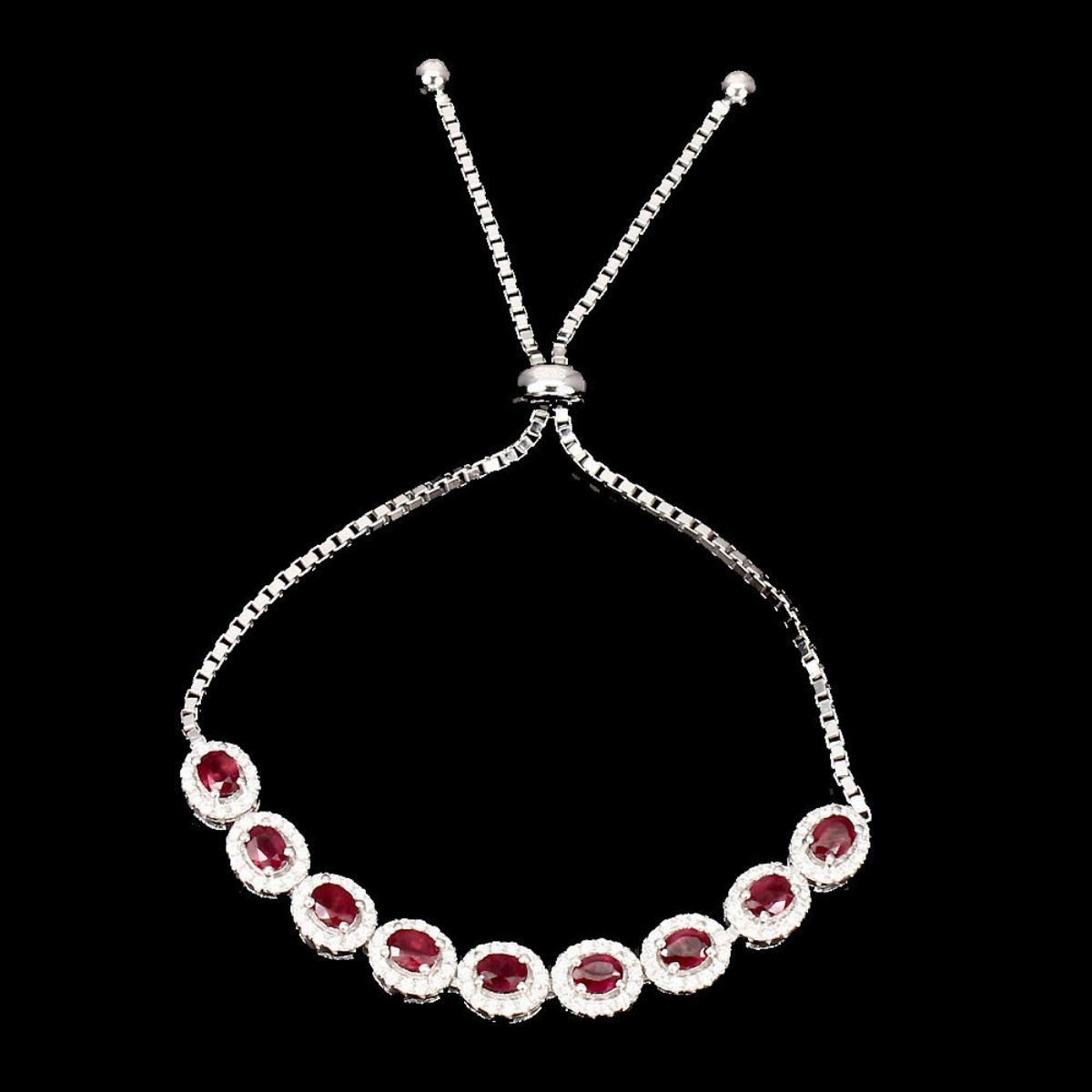 925 STERLING SILVER;PLATE14K WHITE GOLD;LENGTH (INCHES)9;MAIN STONERUBY;OTHER GEMSCUBIC ZIRCONIA;TOTAL WEIGHT40.95 CT (TOTAL WEIGHT OF SILVER + STONE)DIMENSION* STONE 4.0 X 3.0 MM. * CZ 1.0 MM. * FACE BRACELET 70.0 X 6.0 MM.;MAIN STONE SHAPEOVAL CUT;MAIN STONE COLORTOP BLOOD RED;CLARITY/GRADETRANSPARENT;LUSTERGORGEOUS;TREATMENT- yes;ORIGINMADAGASCAR;HARDNESS9.0;