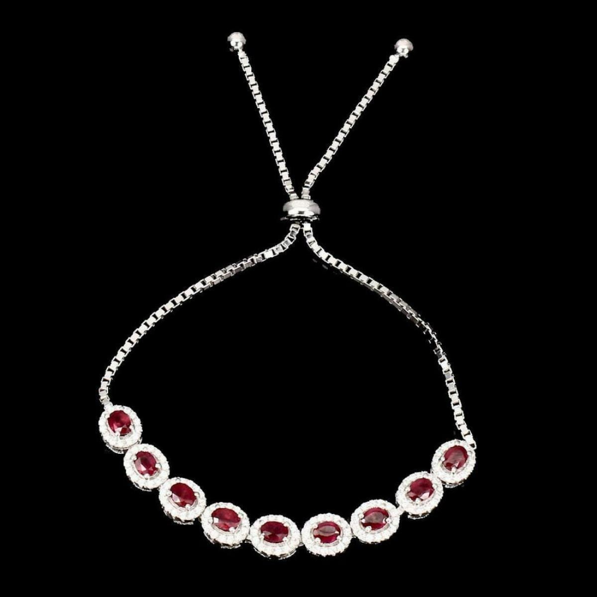 925 STERLING SILVER;PLATE14K WHITE GOLD;LENGTH (INCHES)9;MAIN STONERUBY;OTHER GEMSCUBIC ZIRCONIA;TOTAL WEIGHT40.95 CT (TOTAL WEIGHT OF SILVER + STONE)DIMENSION* STONE 4.0 X 3.0 MM. * CZ 1.0 MM. * FACE BRACELET 70.0 X 6.0 MM.;MAIN STONE SHAPEOVAL CUT;MAIN STONE COLORTOP BLOOD RED;CLARITY/GRADETRANSPARENT;LUSTERGORGEOUS;TREATMENT- yes;ORIGINMADAGASCAR;HARDNESS9.0;