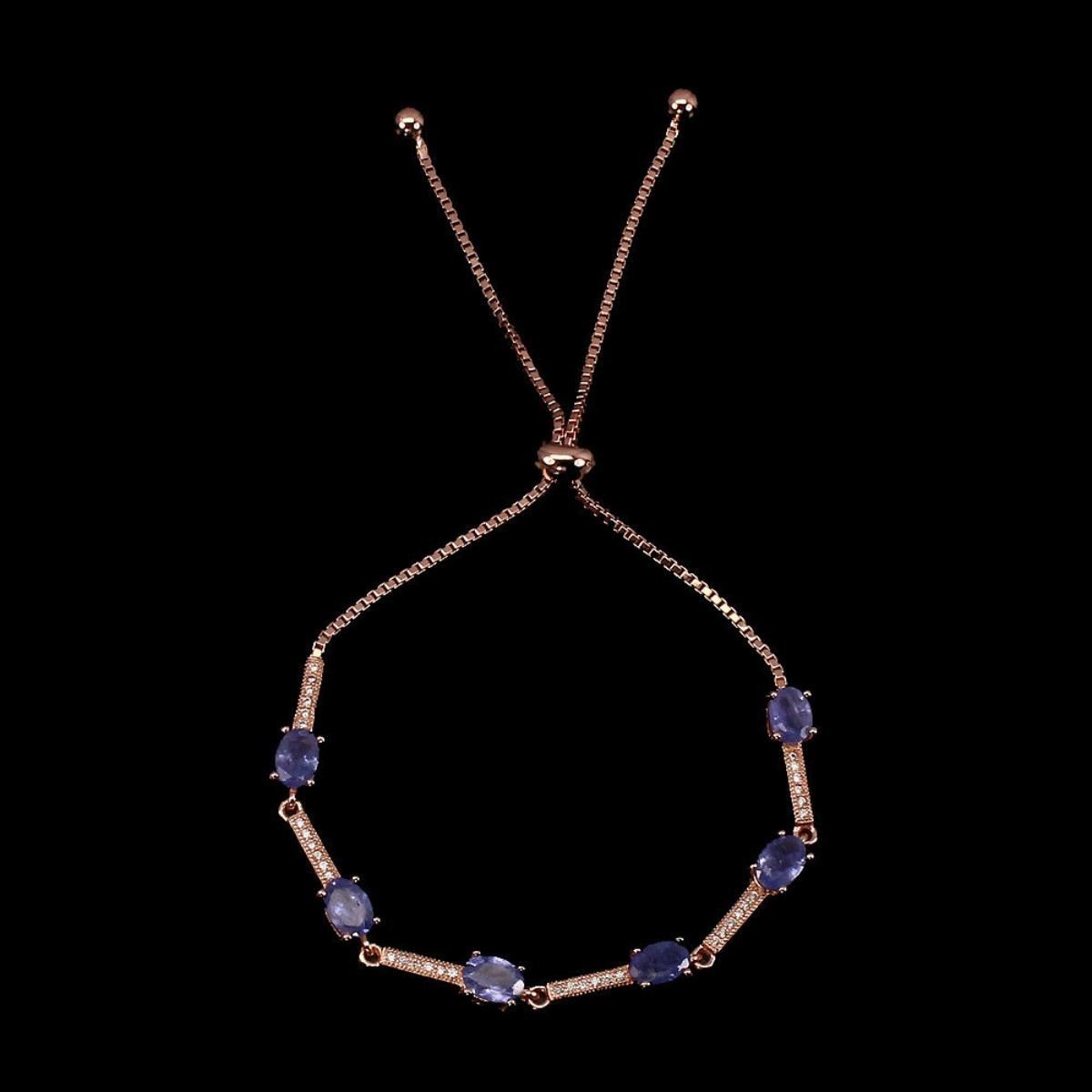 925 STERLING SILVER;PLATE14K ROSE GOLD;LENGTH (INCHES)11;MAIN STONETANZANITE;OTHER GEMSCUBIC ZIRCONIA;TOTAL WEIGHT28.39 CT (TOTAL WEIGHT OF SILVER + STONE)DIMENSION* STONE 6.0 X 4.0 MM. * CZ 1.0 MM. * FACE BRACELET 95.0 X 4.0 MM.;MAIN STONE SHAPEOVAL CUT;MAIN STONE COLORTOP RICH BLUE VIOLET;CLARITY/GRADETRANSPARENT;LUSTERBEWITCHING;TREATMENTUNHEATED;ORIGINTANZANIA - AFRICA;HARDNESS7.0 - 7.5