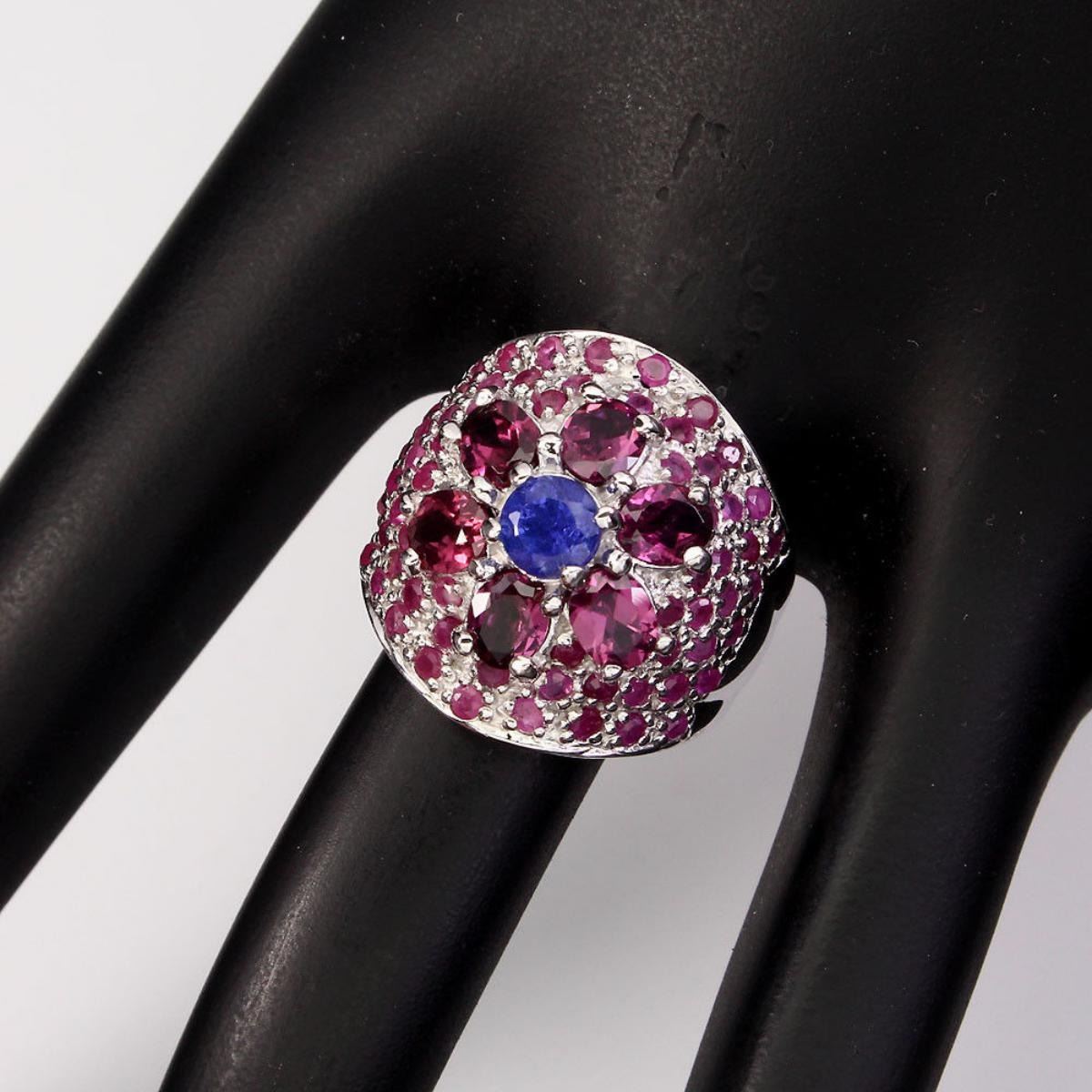 925 STERLING SILVER;PLATE14K WHITE GOLD;RING SIZE8.5 (resizeable)MAIN STONETANZANITEOTHER GEMSRHODOLITE GARNET,RUBYTOTAL WEIGHT39.08 CT (TOTAL WEIGHT OF SILVER + STONE)DIMENSION* STONE 2.0 TO 5.0 X 4.0 MM. * FACE RING 21.0 X 21.0 MM.;MAIN STONE SHAPEROUND CUT;MAIN STONE COLORTOP RICH BLUE VIOLET;CLARITY/GRADEIF TO VVS;LUSTERGORGEOUS;TREATMENTUNHEATED;ORIGINTANZANIA - AFRICA;HARDNESS7.0 - 7.5;
