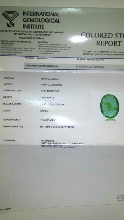 Natural Top Emerald 7.66 Carats........Oval Shape....Certified