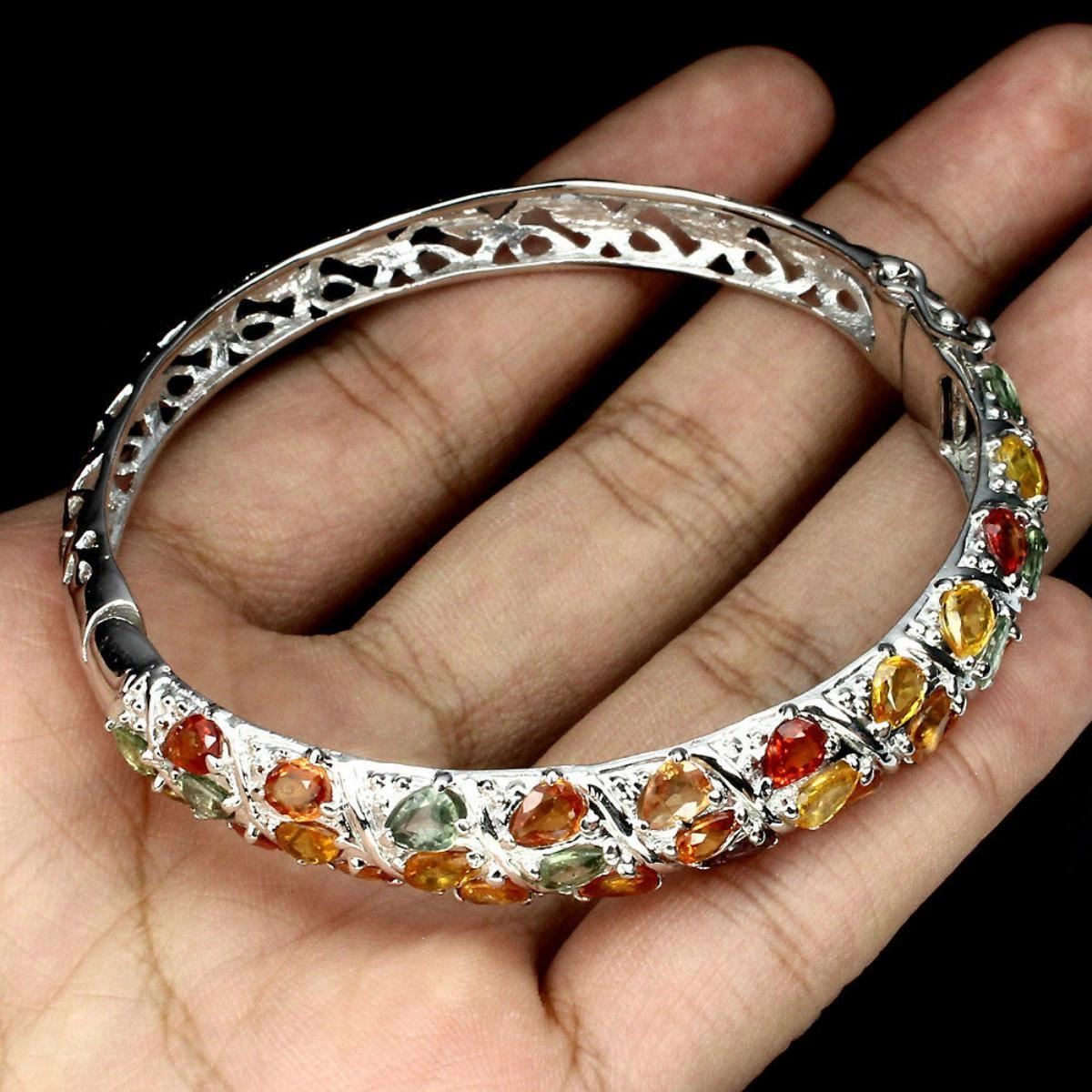 925 STERLING SILVER PLATE 14K WHITE GOLD RING SIZE/LENGTH (INCHES) MAIN STONE SAPPHIRE OTHER GEMS TOTAL WEIGHT 127.08 CT (TOTAL WEIGHT OF SILVER + STONE) DIMENSION * STONE 6.0 X 4.0 MM. * DIAMETER 2.4 X 2.3 INCHES. * FACE BANGLE 69.0 X 10.0 MM. MAIN STONE SHAPE PEAR CUT MAIN STONE COLOR MULTI-COLOR CLARITY/GRADE IF TO VVS LUSTER MESMERIZING TREATMENT HEATED ORIGIN SONGEA - AFRICA HARDNESS 9.0