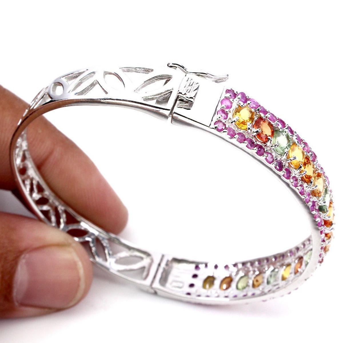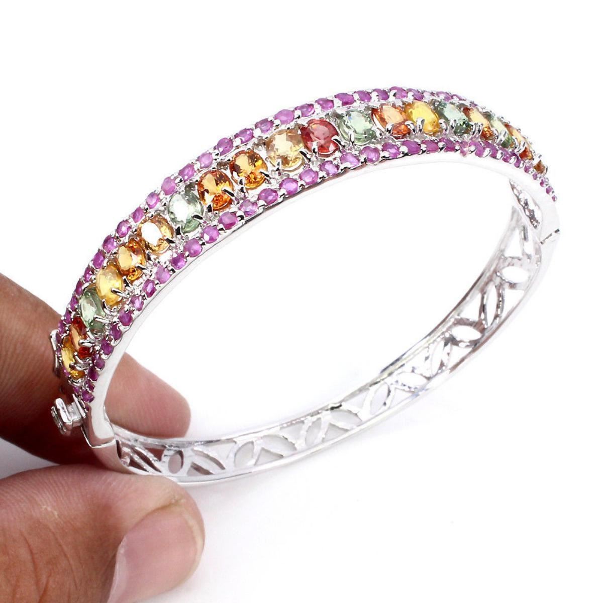 925 STERLING SILVER....PLATE14K WHITE GOLD;;MAIN STONESAPPHIRE;OTHER GEMSRUBY;TOTAL WEIGHT97.18 CT (TOTAL WEIGHT OF SILVER + STONE)DIMENSION* STONE 1.5 TO 4.0 X 3.0 MM. * DIAMETER 2.3 X 2.2 INCHES. * FACE BANGLE 63.0 X 11.0 MM.MAIN STONE SHAPEOVAL CUTMAIN STONE COLORTOP FANCY COLORSCLARITY/GRADEIF TO VVSLUSTERMAGNIFICENTTREATMENTHEATEDORIGINSONGEA - AFRICAHARDNESS9.0