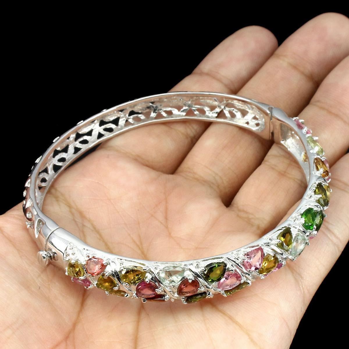 925 STERLING SILVER;PLATE...14K WHITE GOLD;MAIN STONETOURMALINE;TOTAL WEIGHT129.66 CT (TOTAL WEIGHT OF SILVER + STONE)DIMENSION* STONE 5.0 X 3.0 MM. * DIAMETER 2.3 INCHES. * FACE BANGLE 68.0 X 10.0 MM.;MAIN STONE SHAPEPEAR CUT;MAIN STONE COLORTOP FANCY COLORS;CLARITY/GRADEIF TO VVS;LUSTERMESMERIZING;TREATMENTUNHEATED;ORIGINBRAZIL;HARDNESS7.0 - 7.5;