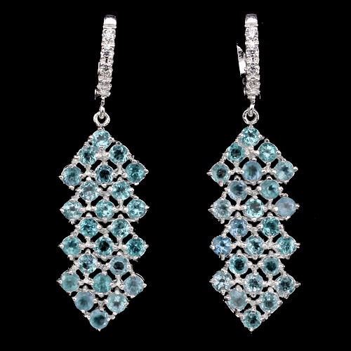 APATITE (NATURAL) CUBIC ZIRCONIA 925 SILVER EARRINGS;UNIT OF ITEM (S):2 PIECES;WEIGHT (CT.):55.80 CT. (total weight of silver + stone)DIMENSION:* STONE 3.0 MM. * CZ 1.5 MM. * FACE EARRINGS 50.0 X 15.0 MM.SHAPE/CUT:ROUND FACET ROUND DIAMOND CUT;COLOR:TOP NEON BLUE AAA WHITE;CLARITY/GRADE:IF TO VVS;LUSTER:GORGEOUS;TREATMENT:UNHEATED;ORIGIN:AFRICA;HARDNESS:5.0