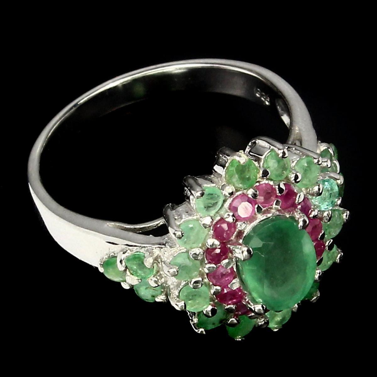 925 STERLING SILVER;PLATE14K WHITE GOLD;RING SIZE -8 (resizeable)MAIN STONEEMERALD;OTHER GEMSRUBY;TOTAL WEIGHT22.40 CT (TOTAL WEIGHT OF SILVER + STONE)DIMENSION* STONE 1.5 TO 7.0 X 5.0 MM. * RING SIZE 8.0 * FACE RING 19.0 X 15.0 MM.;MAIN STONE SHAPEOVAL CUT;MAIN STONE COLORTOP RICH GREEN;CLARITY/GRADETRANSPARENT;LUSTERDELUXE;TREATMENTUNHEATED;ORIGINBRAZIL;