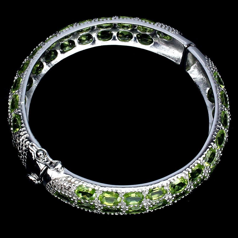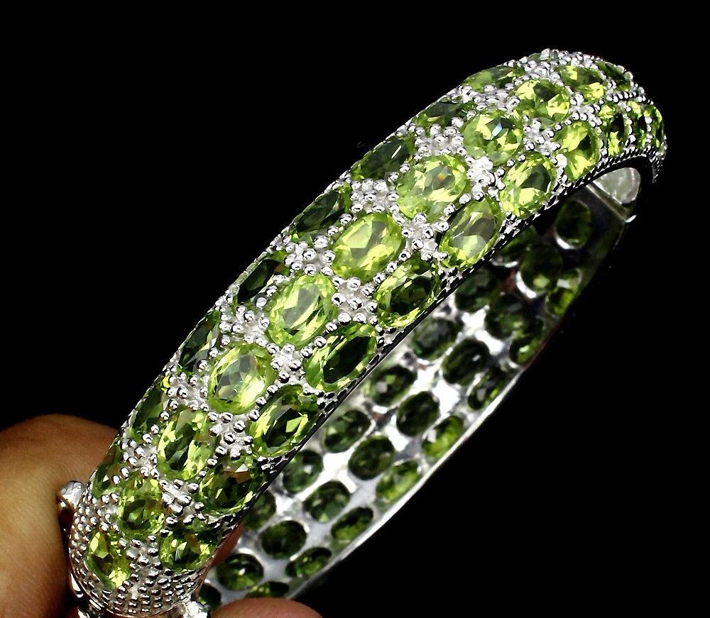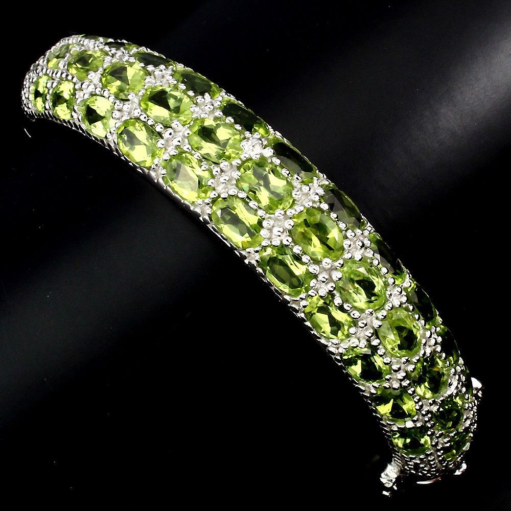 925 STERLING SILVER; PLATE -14K WHITE GOLD; LENGTH (INCHES) 2.25; MAIN STONE -PERIDOT; TOTAL WEIGHT -165.13 CT (TOTAL WEIGHT OF SILVER + STONE) DIMENSION * STONE 6.0 X 4.0 MM. * DIAMETER 2.0 X 1.9 INCHES. * FACE BANGLE 66.0 X 12.0 MM. MAIN STONE SHAPE -OVAL CUT; MAIN STONE COLOR -TOP RICH GREEN; CLARITY/GRADE -IF TO VVS; LUSTER -PRECIOUS; TREATMENT -UNHEATED; ORIGIN -PAKISTAN; HARDNESS -6.5 - 7.0