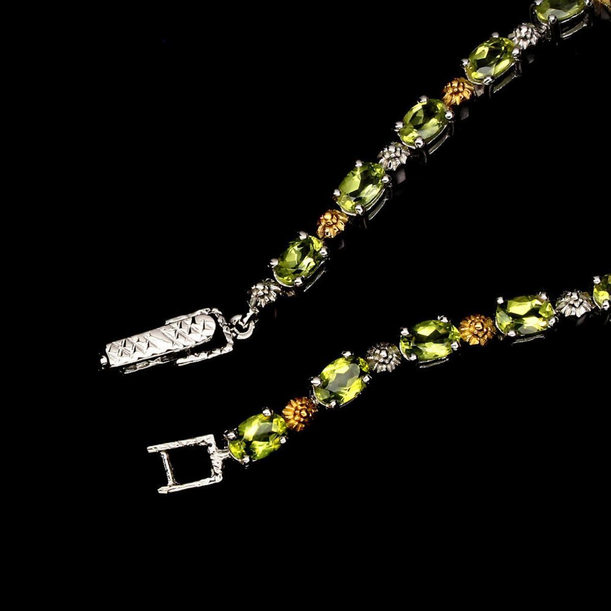 925 STERLING SILVER;PLATE2-TONE WHITE & YELLOW 14K GOLD;LENGTH (INCHES)7MAIN STONEPERIDOT;OTHER GEMS;TOTAL WEIGHT65.21 CT (TOTAL WEIGHT OF SILVER + STONE)DIMENSION* STONE 6.0 X 4.0 MM. * FACE BRACELET 160.0 X 5.0 MM.MAIN STONE SHAPEOVAL CUT;MAIN STONE COLORTOP RICH GREEN;CLARITY/GRADEIF TO VVS;LUSTERRAVISHING;TREATMENTUNHEATED;ORIGINPAKISTAN;HARDNESS6.5 - 7.0