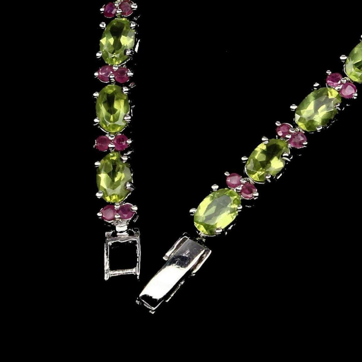 925 STERLING SILVER;PLATE14K WHITE GOLD;LENGTH (INCHES)7.5;;MAIN STONEPERIDOT;OTHER GEMSRUBY;TOTAL WEIGHT63.32 CT (TOTAL WEIGHT OF SILVER + STONE)DIMENSION* STONE 2.0 TO 6.0 X 4.0 MM. * FACE BRACELET 184.0 X 5.0 MM.MAIN STONE SHAPEOVAL CUT;MAIN STONE COLORTOP RICH GREEN;CLARITY/GRADEIF TO VVS;LUSTERGORGEOUS;TREATMENTUNHEATED;ORIGINPAKISTAN;HARDNESS6.5 - 9.0;