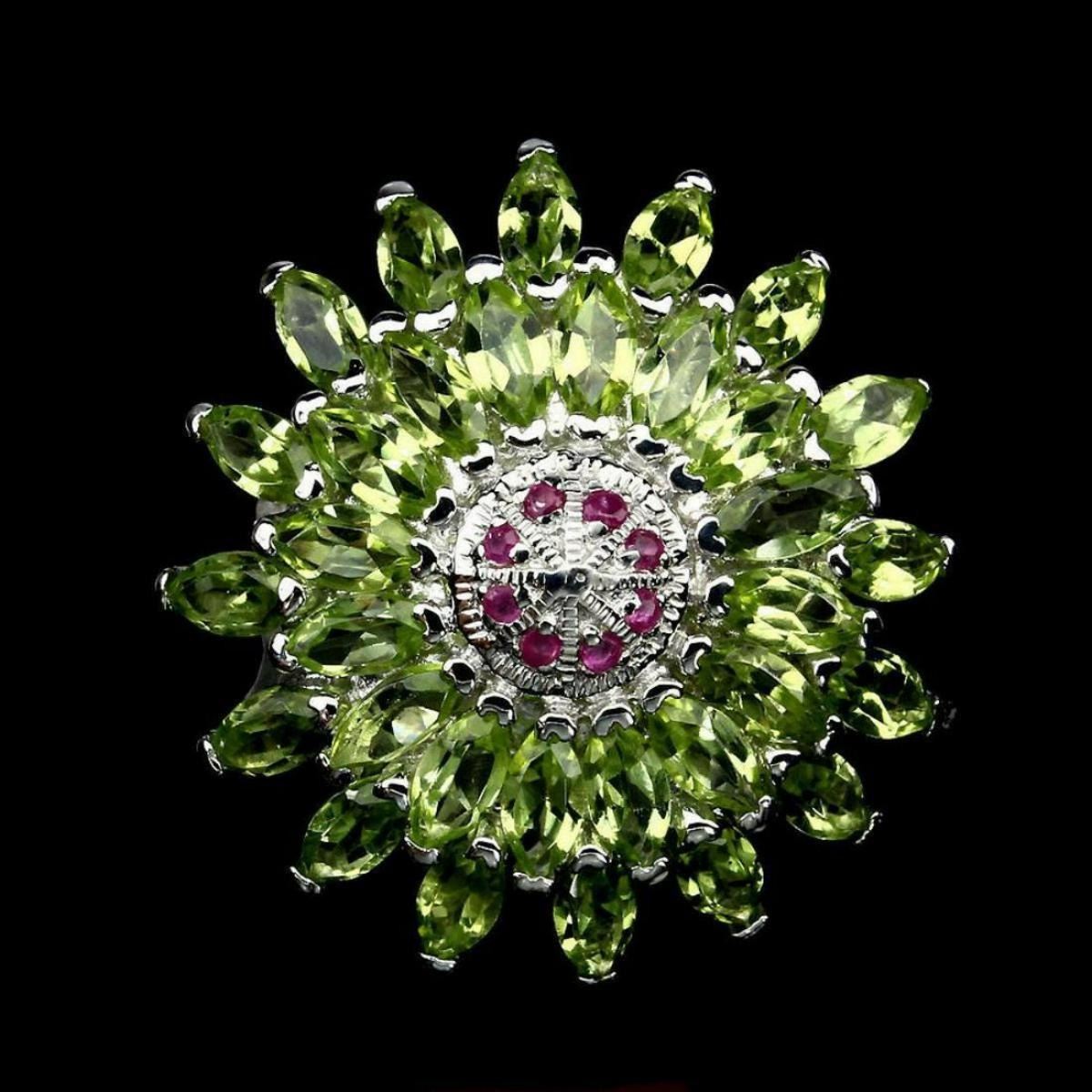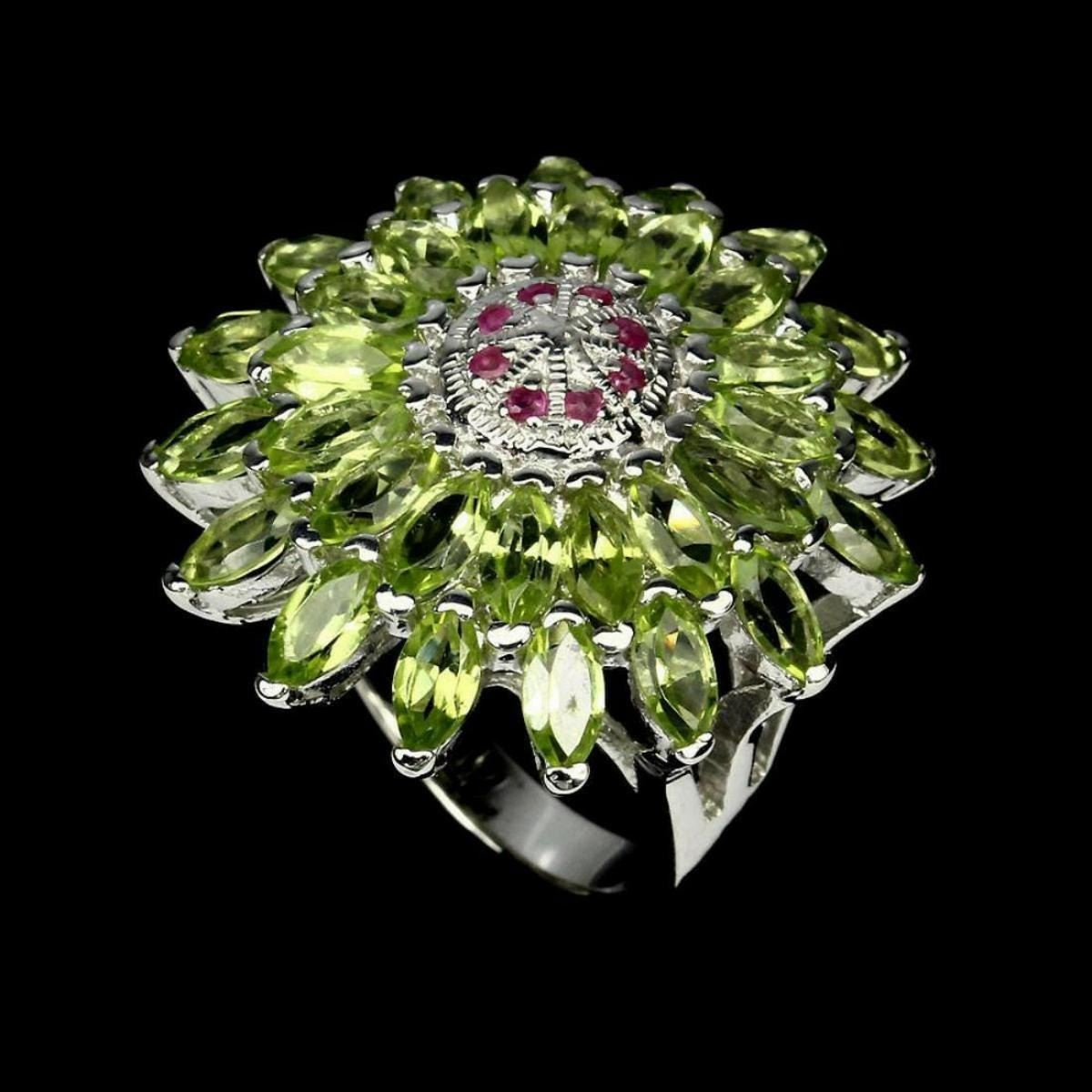 Main Stone:PeridotMetal:925 sterling silverMain Stone Shape:Marquise CutBase Metal:Fine Silver, 925 parts per 1000Main Stone Color:Top Rich GreenStyle:Solitaire with Accents;Main Stone Treatment:Unheated;Metal Purity:925 parts per 1000;Secondary Stone:RubyRing Size:9(resizeable);Luster:GorgeousPlate:14k White GoldTreatment:Unheated;Origin:Pakistan;Hardness:6.5 - 9.0