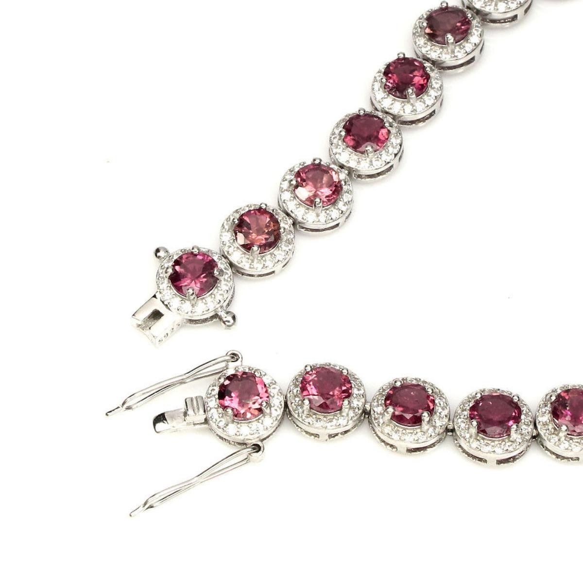 925 STERLING SILVER;PLATE....14K WHITE GOLD;LENGTH (INCHES)8MAIN STONETOURMALINEOTHER GEMSCUBIC ZIRCONIATOTAL WEIGHT70.07 CT (TOTAL WEIGHT OF SILVER + STONE)DIMENSION* STONE 4.5 MM. * CZ 1.0 MM. * FACE BRACELET 190.0 X 8.0 MM.MAIN STONE SHAPEROUND CUTMAIN STONE COLORTOP RICH PINKCLARITY/GRADEIF TO VVSLUSTERPRECIOUSTREATMENTUNHEATEDORIGINBRAZIL