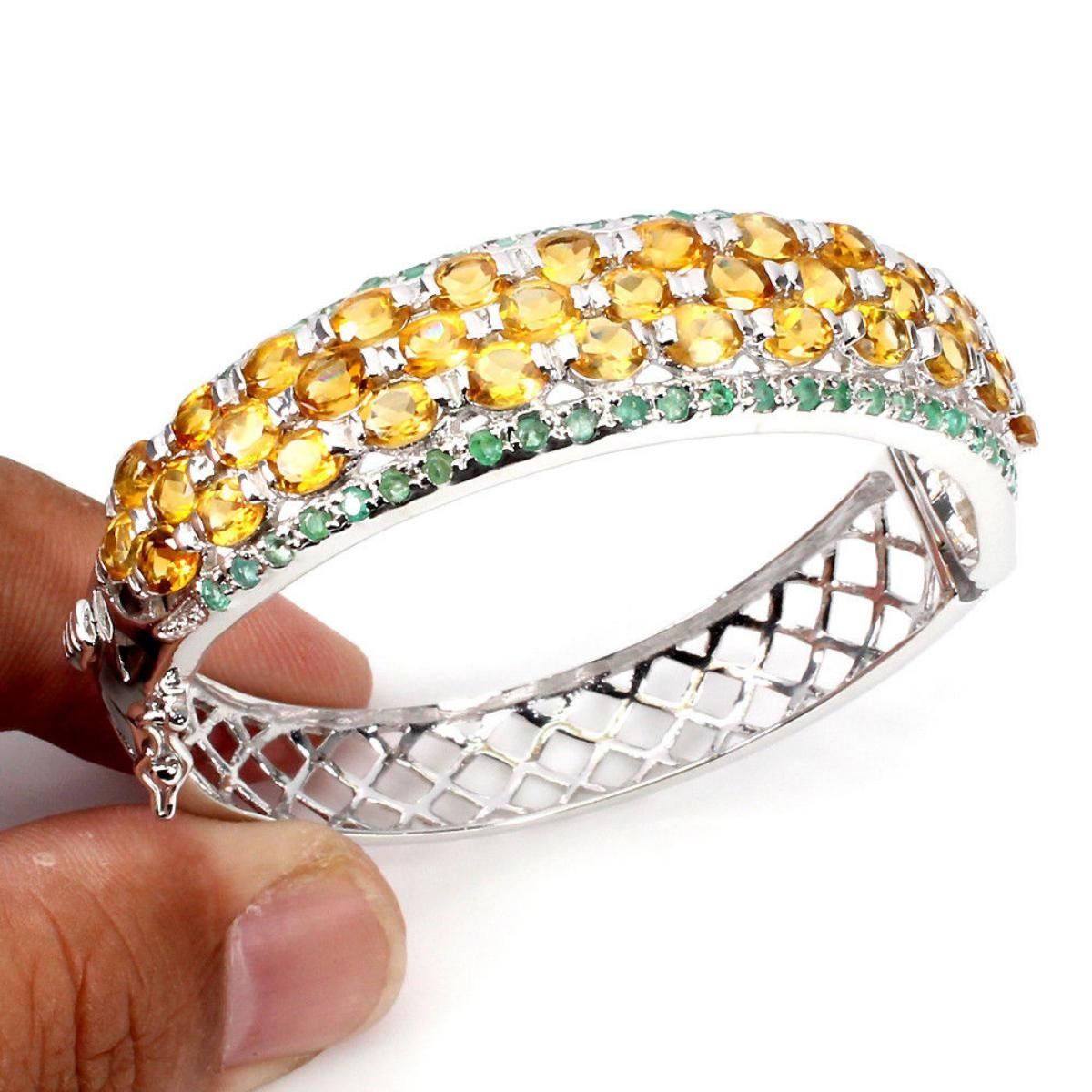 925 STERLING SILVER..... PLATE...... 14K WHITE GOLD... MAIN STONE CITRINE OTHER GEMS EMERALD TOTAL WEIGHT 137.63 CT (TOTAL WEIGHT OF SILVER + STONE) DIMENSION * STONE 1.5 TO 5.0 X 3.0 MM. * DIAMETER 2.0 X 1.9 INCHES. * FACE BANGLE 64.0 X 15.0 MM. MAIN STONE SHAPE OVAL CUT MAIN STONE COLOR TOP RICH YELLOW CLARITY/GRADE IF TO VVS LUSTER GLORIOUS TREATMENT UNHEATED ORIGIN BRAZIL