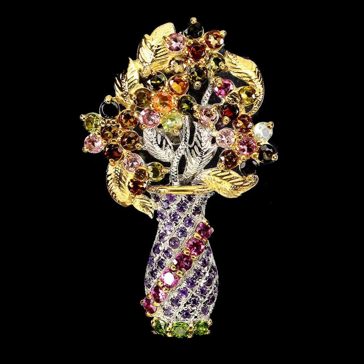 925 STERLING SILVER;PLATE-2-TONE WHITE & YELLOW 14K GOLD;MAIN STONE-TOURMALINE;OTHER GEMS-AMETHYST, CHROME DIOPSIDE, RHODOLITE GARNETTOTAL WEIGHT-10.63 GRAM (TOTAL WEIGHT OF SILVER + STONE)DIMENSION-* STONE 1.5 TO 3.0 MM. * FACE BROOCH 51.0 X 31.0 MM.MAIN STONE SHAPE-ROUND CUT;MAIN STONE COLOR-MULTI-COLOR;CLARITY/GRADE- IF TO VVS;TREATMENT- UNHEATED;ORIGIN -BRAZIL;HARDNESS-7.0-7.5;-