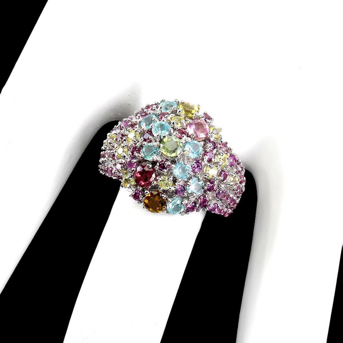 925 STERLING SILVER;PLATE-14K WHITE GOLD;RING SIZE/resizeable-8;MAIN STONE---APATITE, PERIDOT, RHODOLITE GARNET;TOTAL WEIGHT-5.66 GRAM (TOTAL WEIGHT OF SILVER + STONE)DIMENSION-* STONE 1.5 TO 3.0 MM. * RING SIZE 8.0 * FACE RING 22.0 X 17.0 MM.;MAIN STONE SHAPE-ROUND CUT;MAIN STONE COLOR-MULTI-COLOR;CLARITY/GRADE-IF TO VVS;TREATMENT-UNHEATED;ORIGIN-BRAZIL;HARDNESS-7.0-7.5;
