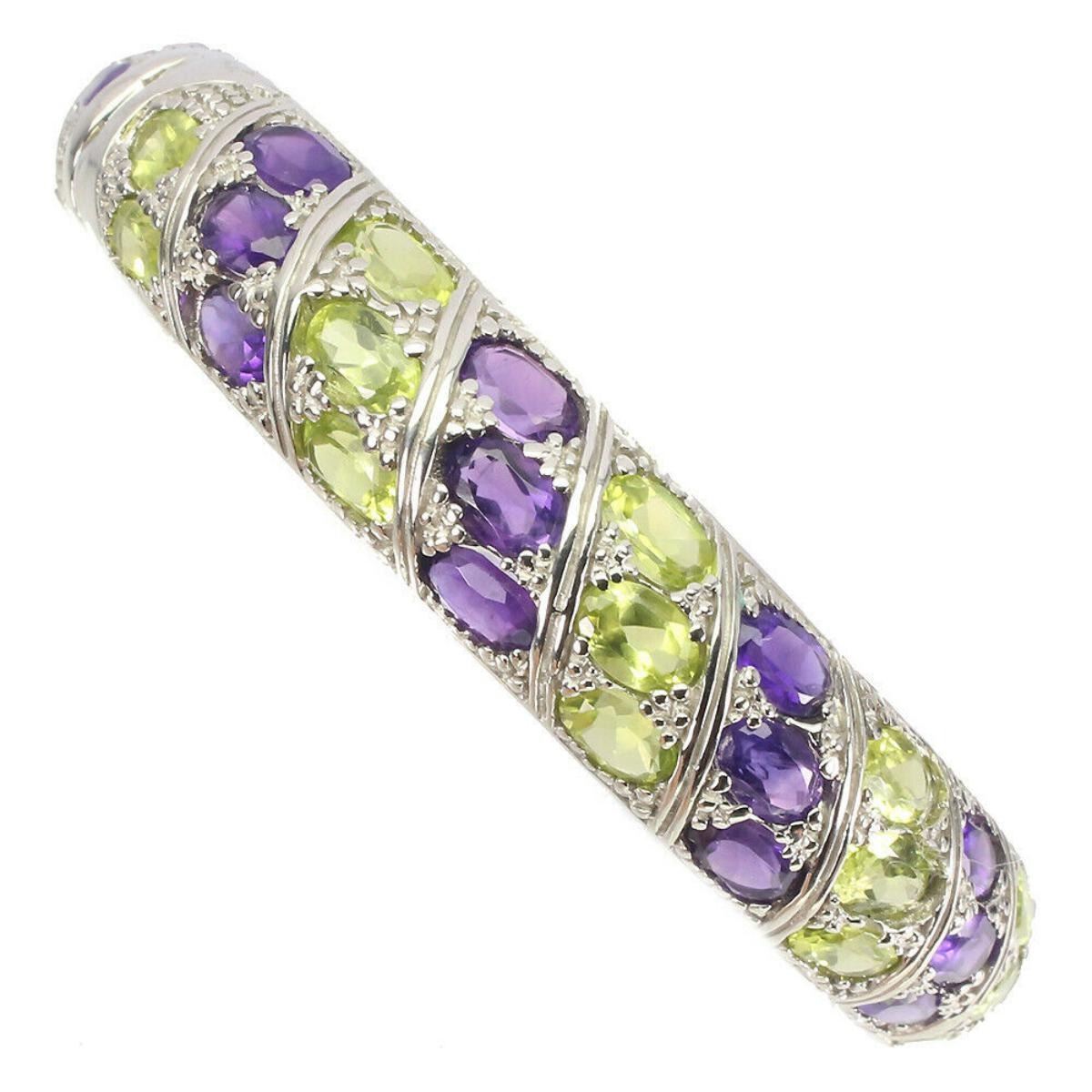 925 STERLING SILVER;PLATE-14K WHITE GOLD;MAIN STONE-AMETHYST;OTHER GEMS-PERIDOT;TOTAL WEIGHT-40.97 GRAM (TOTAL WEIGHT OF SILVER + STONE);DIMENSION-* STONE 6.0 X 4.0 MM. * DIAMETER 2.0 X 2.0 INCHES. * FACE BANGLE- 67.0 X 12.0 MM.;MAIN STONE SHAPE-OVAL CUT;MAIN STONE COLOR- PURPLE;TREATMENT-UNHEATED;ORIGIN-URUGUAY;HARDNESS-7;