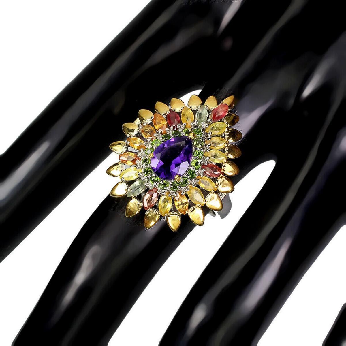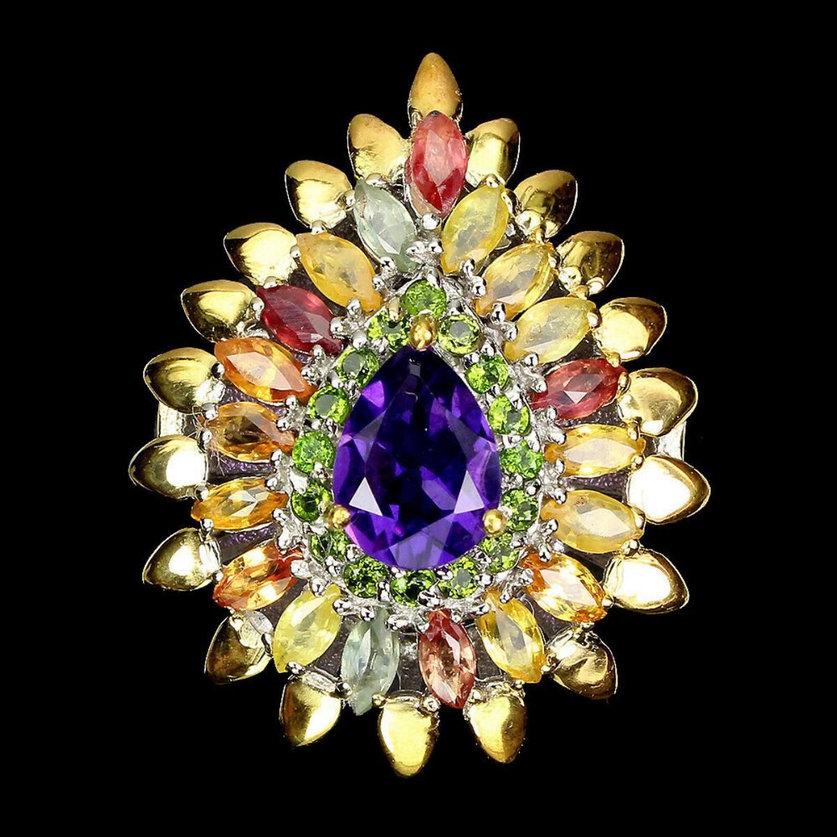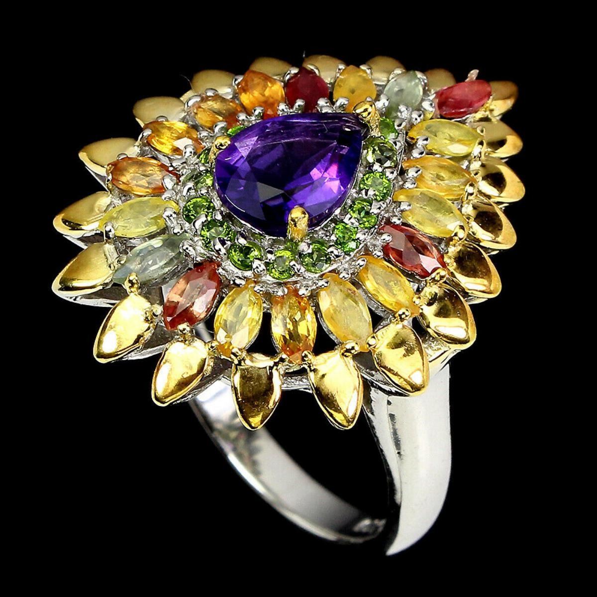 925 STERLING SILVER;PLATE-2-TONE WHITE & YELLOW 14K GOLD;RING SIZE-9(RESIZABLE);MAIN STONE-AMETHYST;OTHER GEMS-CHROME DIOPSIDE, SAPPHIRE;TOTAL WEIGHT-7.12 GRAM (TOTAL WEIGHT OF SILVER + STONE);DIMENSION-* STONE 1.5 TO 8.0 X 6.0 MM. * RING SIZE 9.0 * FACE RING 27.0 X 21.0 MM.;MAIN STONE SHAPE-PEAR CUT;MAIN STONE COLOR- PURPLE;CLARITY/GRADE-IF TO VVS;TREATMENT-UNHEATED;ORIGIN-URUGUAY;HARDNESS-7;