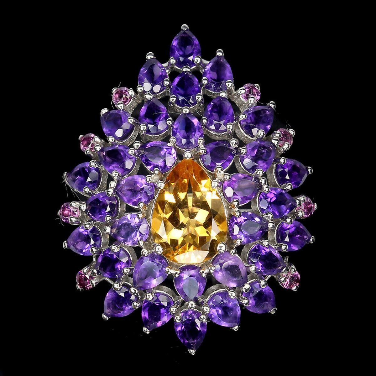 925 STERLING SILVER;PLATE-14K WHITE GOLD;RING SIZE-8.5(RESIZABLE);MAIN STONE-CITRINE;OTHER GEMS-AMETHYST, RHODOLITE GARNET;TOTAL WEIGHT-6.94 GRAM (TOTAL WEIGHT OF SILVER + STONE);DIMENSION-* STONE 2.0 TO 10.0 X 7.0 MM. * RING SIZE 8.5 * FACE RING 32.0 X 25.0 MM.;MAIN STONE SHAPE-PEAR CUT;MAIN STONE COLOR-RICH YELLOW;CLARITY/GRADE-IF;TREATMENT-UNHEATED;ORIGIN-BRAZIL;HARDNESS-7;