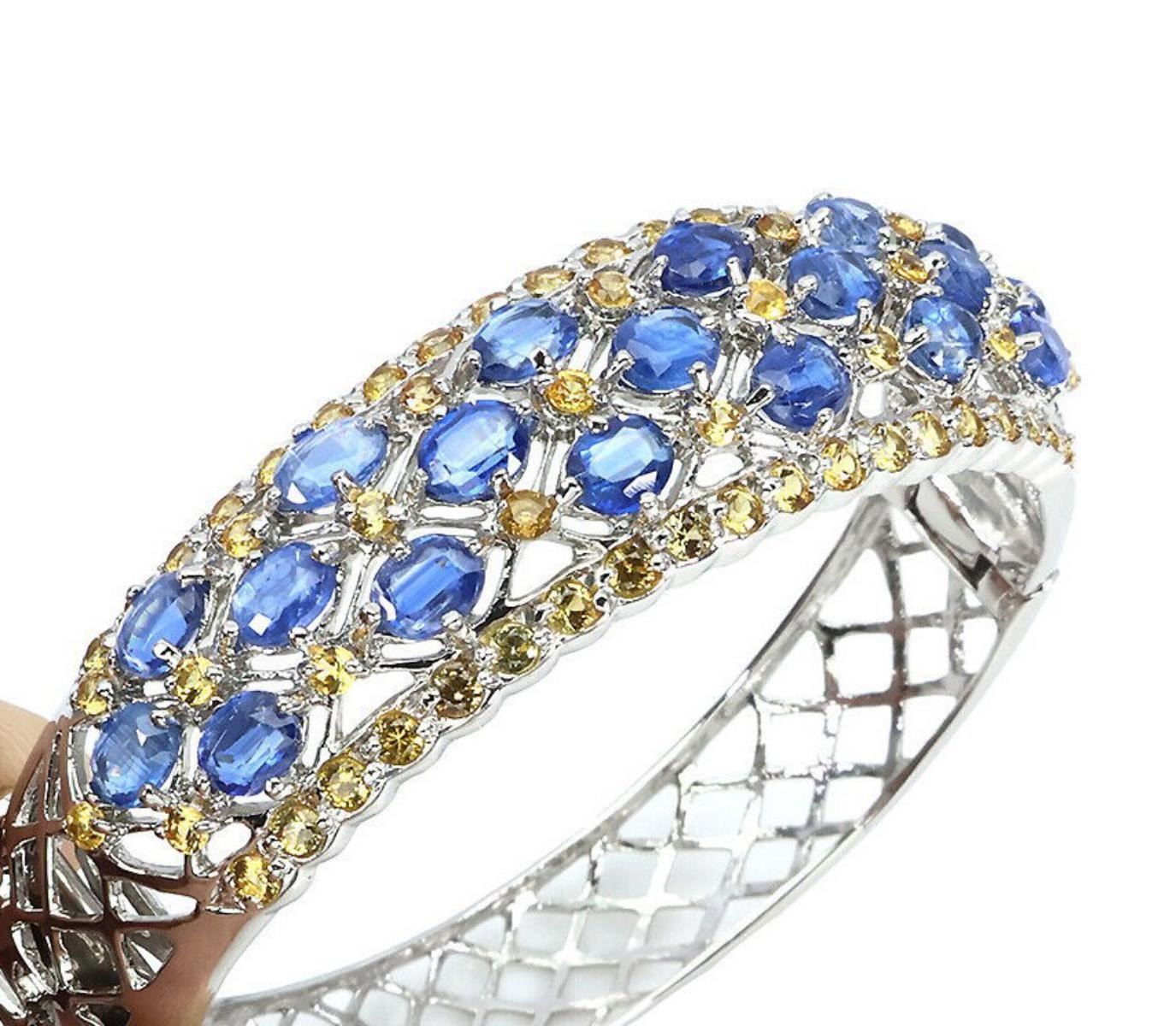 925 STERLING SILVER;PLATE-14K WHITE GOLD;MAIN STONE-KYANITE;OTHER GEMS-SAPPHIRE;TOTAL WEIGHT-23.69 GRAM (TOTAL WEIGHT OF SILVER + STONE);DIMENSION-* STONE 2.0 TO 5.0 X 4.0 MM.* DIAMETER 2.1 X 2.0 INCHES.* FACE BANGLE 58.0 X 17.0 MM.;MAIN STONE SHAPE-OVAL;MAIN STONE COLOR- BLUE;CLARITY/GRADE-IF TO VVS;TREATMENT-UNHEATED;ORIGIN-NEPAL;HARDNESS-5.0 - 7.0;
