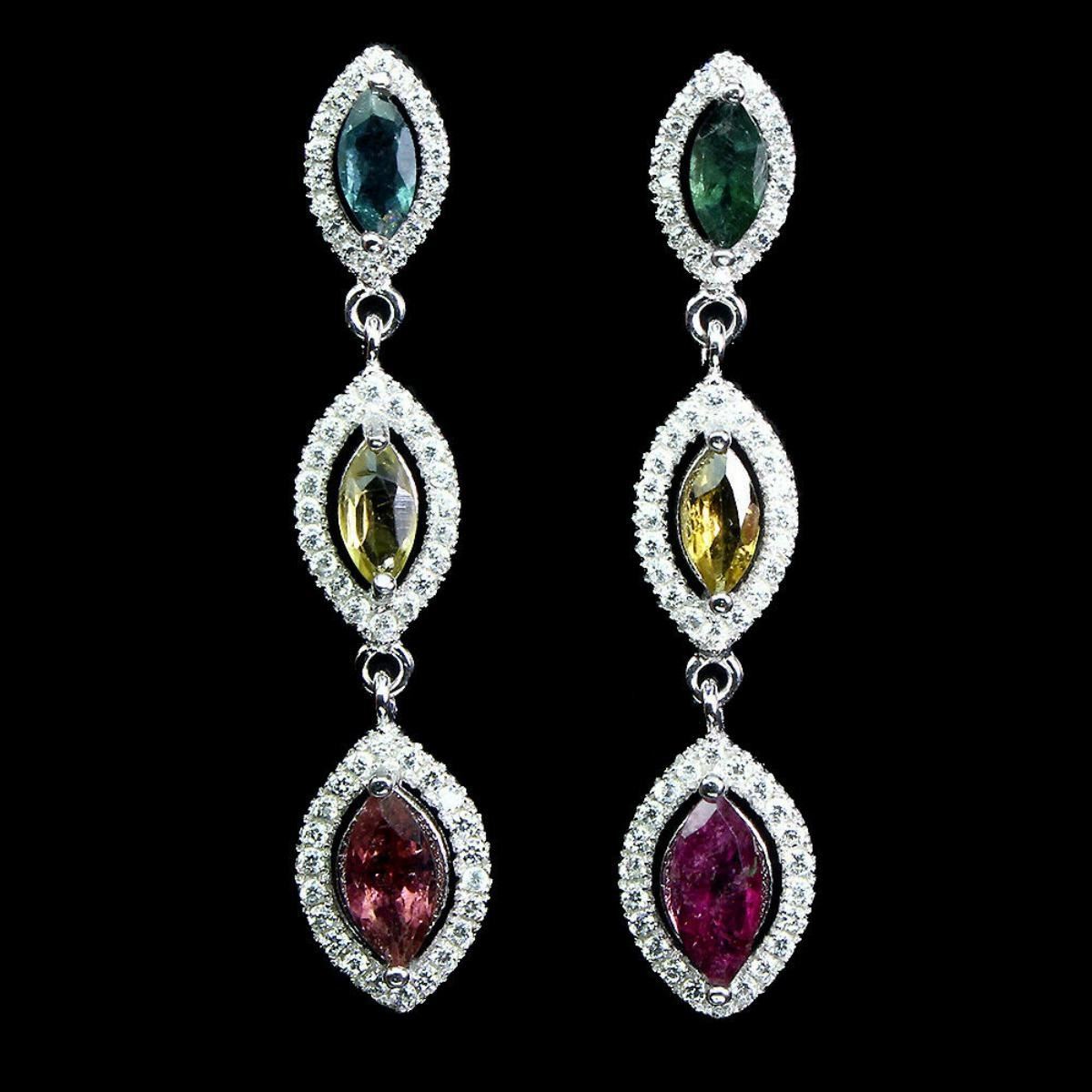 925 STERLING SILVER;PLATE-14K WHITE GOLD;MAIN STONE-TOURMALINE;TOTAL WEIGHT-5.35 CT (TOTAL WEIGHT OF SILVER + STONE)DIMENSION* STONE 6.0 X 3.0 TO 8.0 X 4.0 MM. * CZ 1.0 MM. * FACE EARRINGS -42.0 X 8.0 MM.MAIN STONE SHAPE-MARQUISE CUTMAIN STONE COLOR-MULTI-COLORTREATMENT-UNHEATED;ORIGIN-BRAZIL;HARDNESS-7.0-7.5;