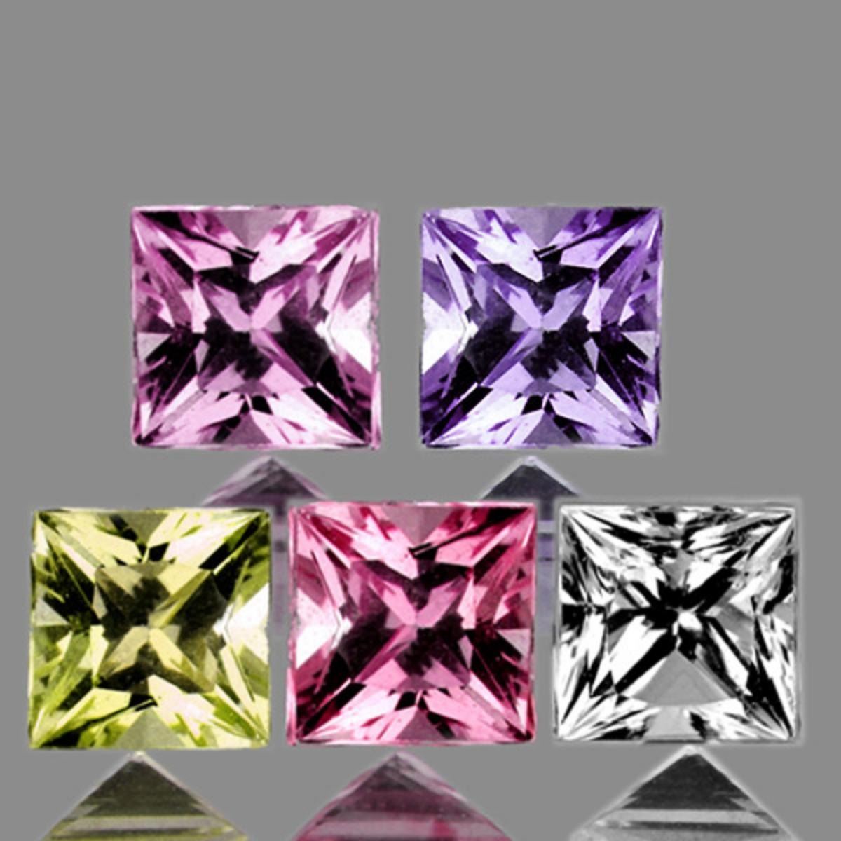 Natural Sapphire (Earthly mined)SIZE ( L x W x D ) : 3.30 mm;COLOR : Multi Color(Shades of Pink, White, Yellow, Purple, Green, Orange)SHAPE : SquareQUANTITY : 5 pieces; LUSTER : Excellent;CLARITY : Flawless-VVS;HARDNESS : 9;ORIGIN : Mozambique; TREATMENT : Unheated/Untreated